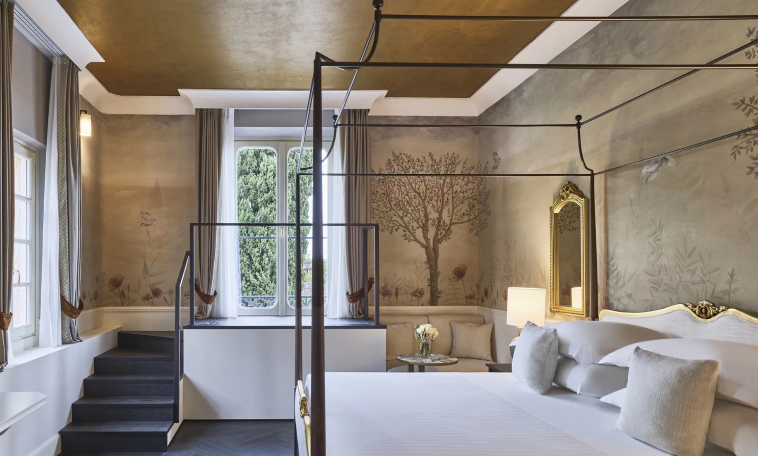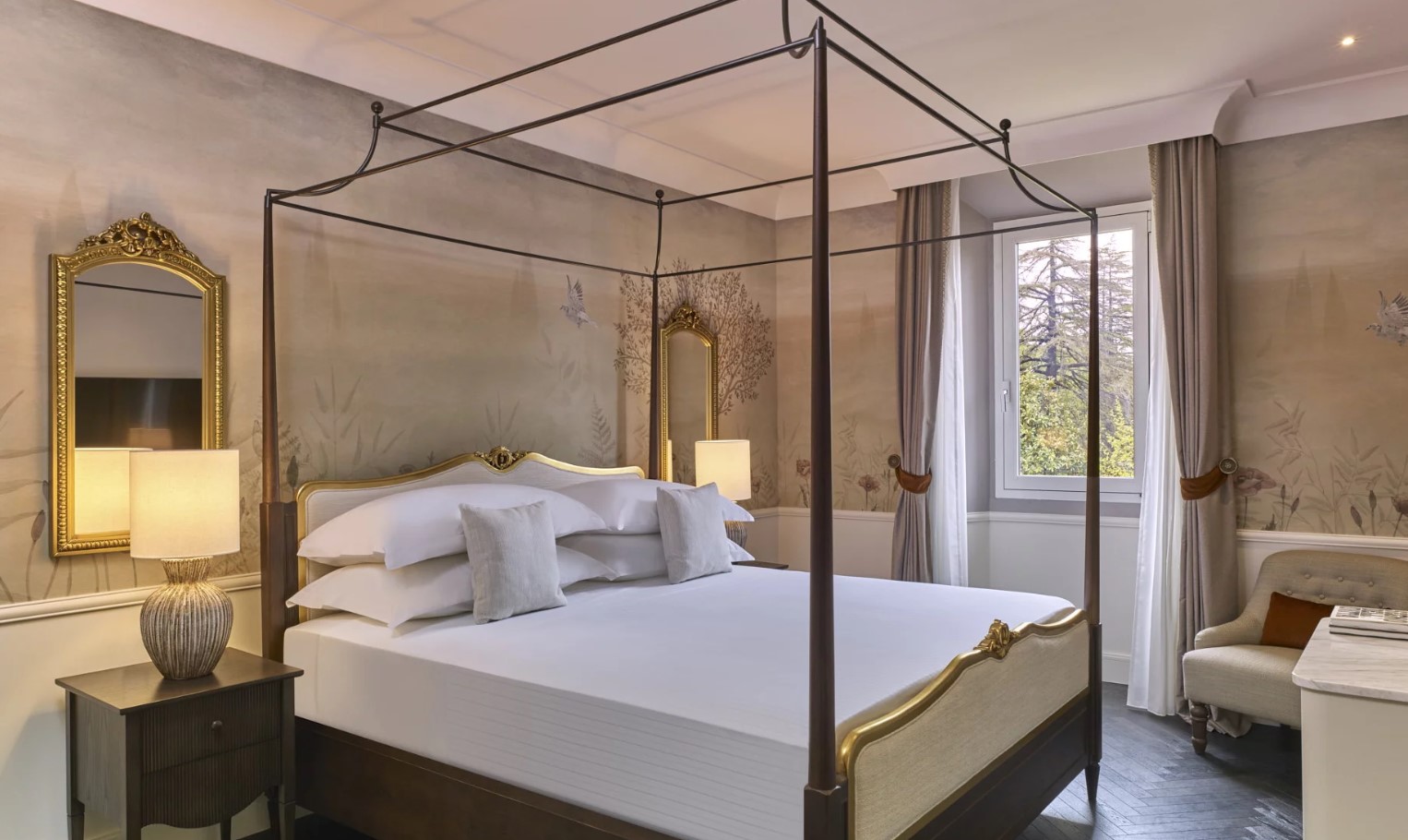 Великолепный номер Giuseppe Garibaldi Grand Deluxe с террасой наполнен светом. Расположенный в центре главного здания, он имеет террасу с видом на фасад исторической спа-виллы и территорию. Он украшен всем стилем и элегантностью Тосканы, вдохновленной садами и природой. Тона натуральных тканей соответствуют цвету деревянного паркета. Стены украшают фрески с изображением деревьев, диких трав и цветов, а карнизы и детали источают тонкое великолепие старинной позолоты. Просторный и гостеприимный, площадью 38 м2, он выходит на террасу с видом на сады. Мраморная ванная комната теплых тонов похожа на миниатюрный частный спа-салон.