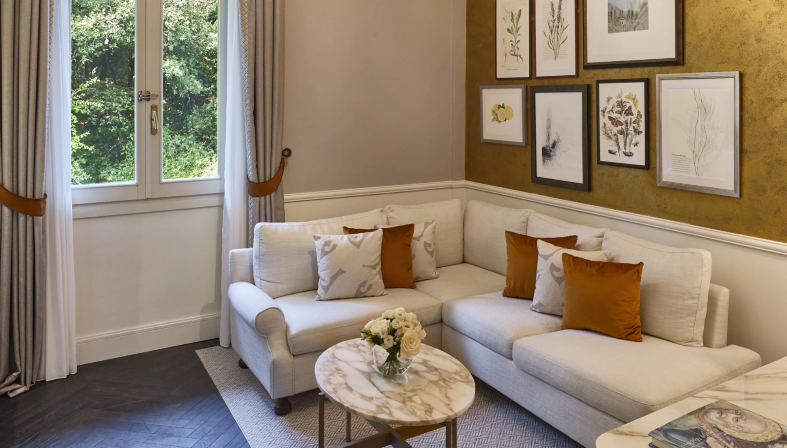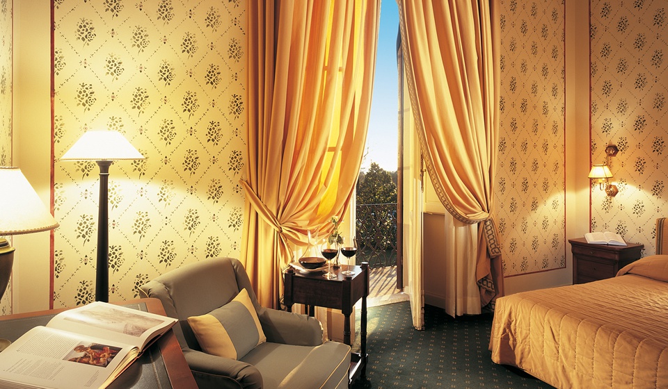 Полулюкс находится на третьем этаже отеля, с видом на лес, окружающий курорт. Сегодня он наполнен новой элегантностью, сочетая в себе природу парка и типичный стиль тосканских вилл. Теплые и яркие цвета сельской местности присутствуют в тканях, коврах и ценных породах дерева, а также в мебели, каждая деталь которой выражает заботу великого итальянского мастерства. Он включает в себя ванную комнату, отделанную каррарским мрамором, удобную двуспальную кровать и гостиную для минут отдыха.