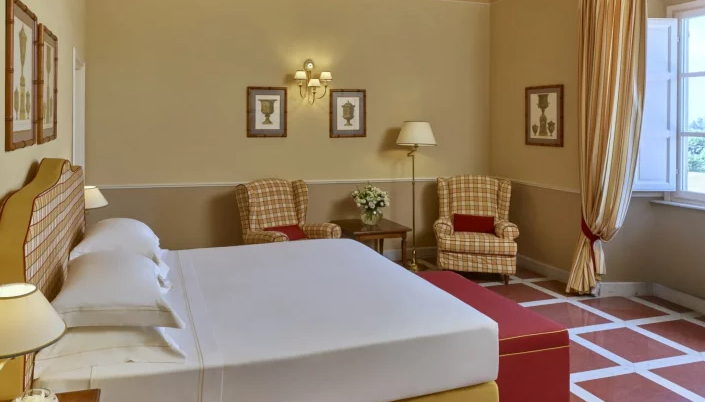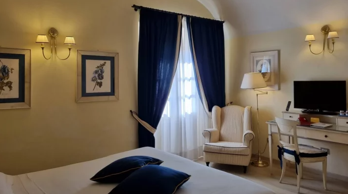 Номера варьируются от номеров Comfort, простых, но гостеприимных, до элегантных люксов с оригинальными сводами XVIII века, расписанными фресками в пастельных тонах, паркетными мезонинами и полами из мрамора, граниты и тосканской терракоты.
