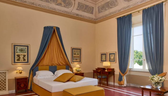 Красивый просторный номер с яркой, уникальной обстановкой, оборудованный кроватями с балдахином, высокими сводчатыми потолками и прекрасными фресками XVIII века в пастельных тонах.