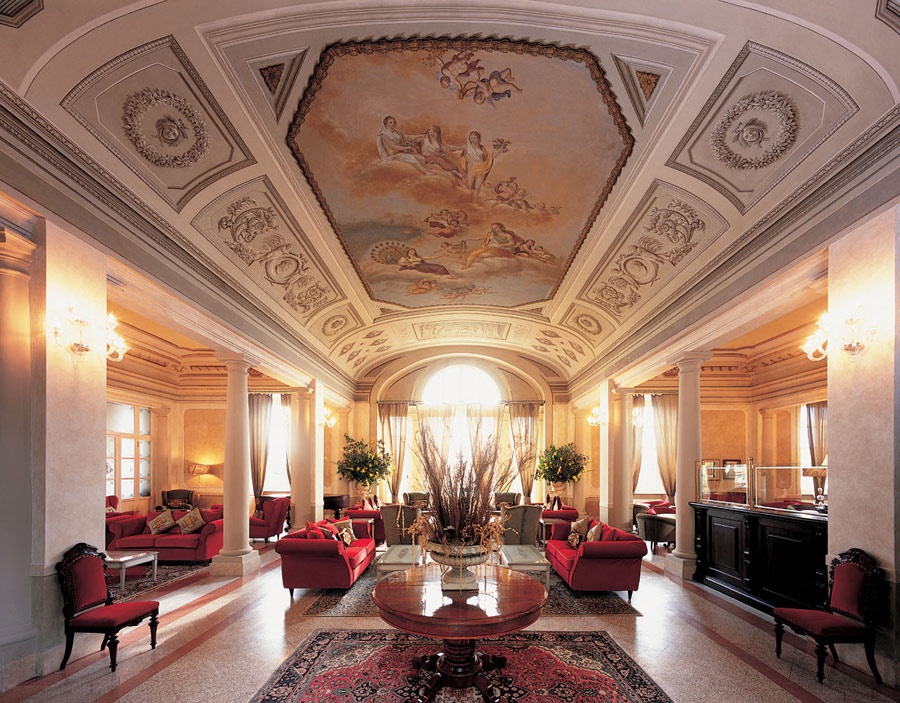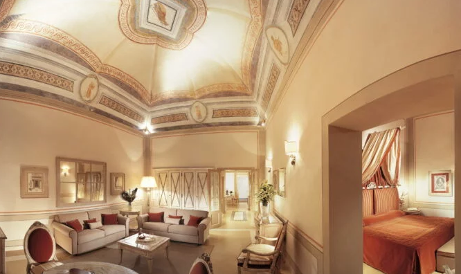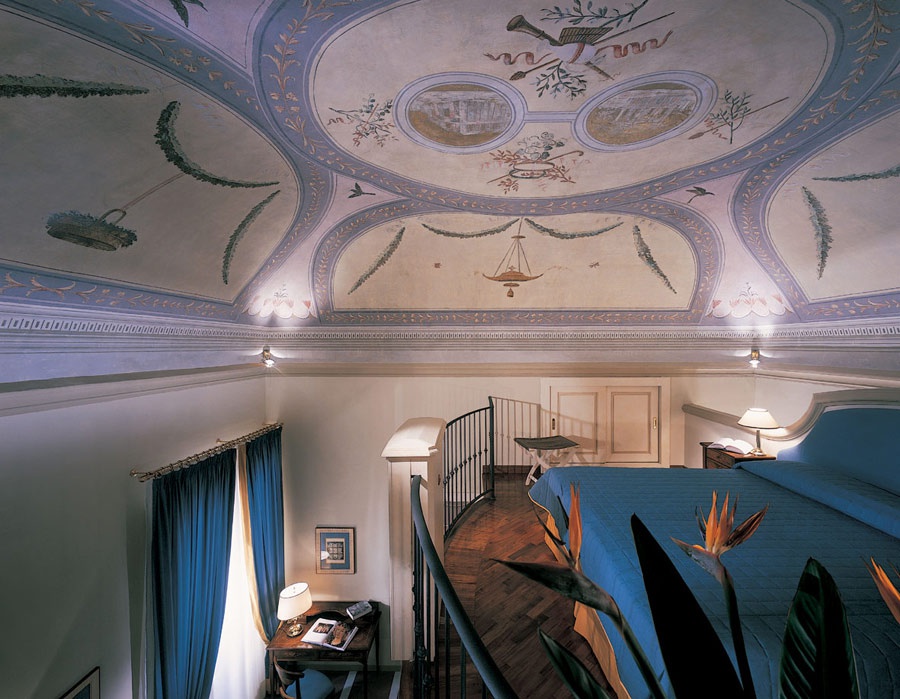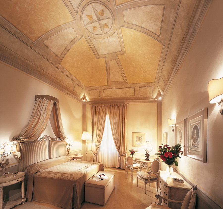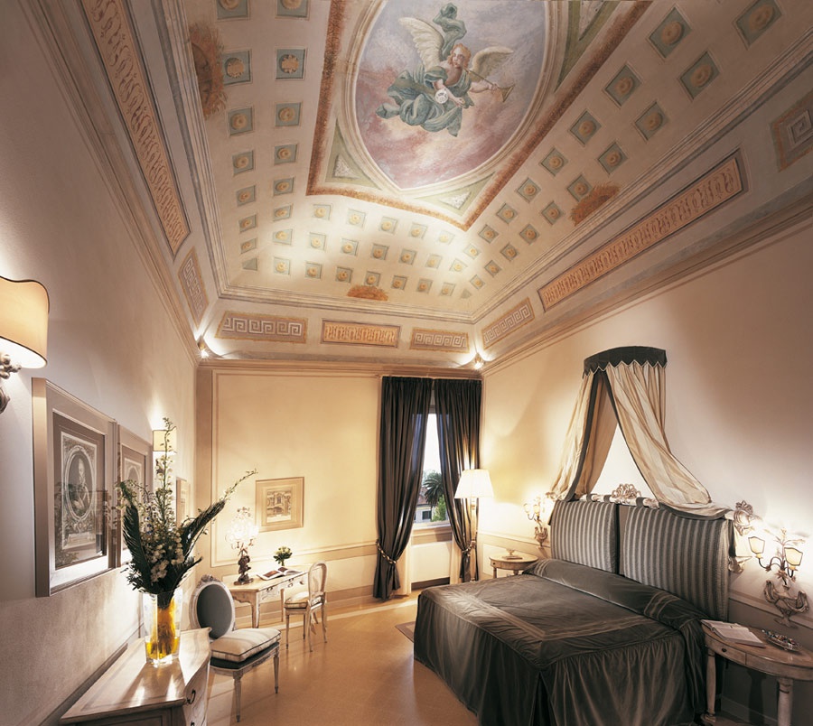 Престижный номер, очень просторный и светлый, с кроватями с балдахином, украшенный великолепными оригинальными фресками 18 века. Мраморные ванные комнаты.
