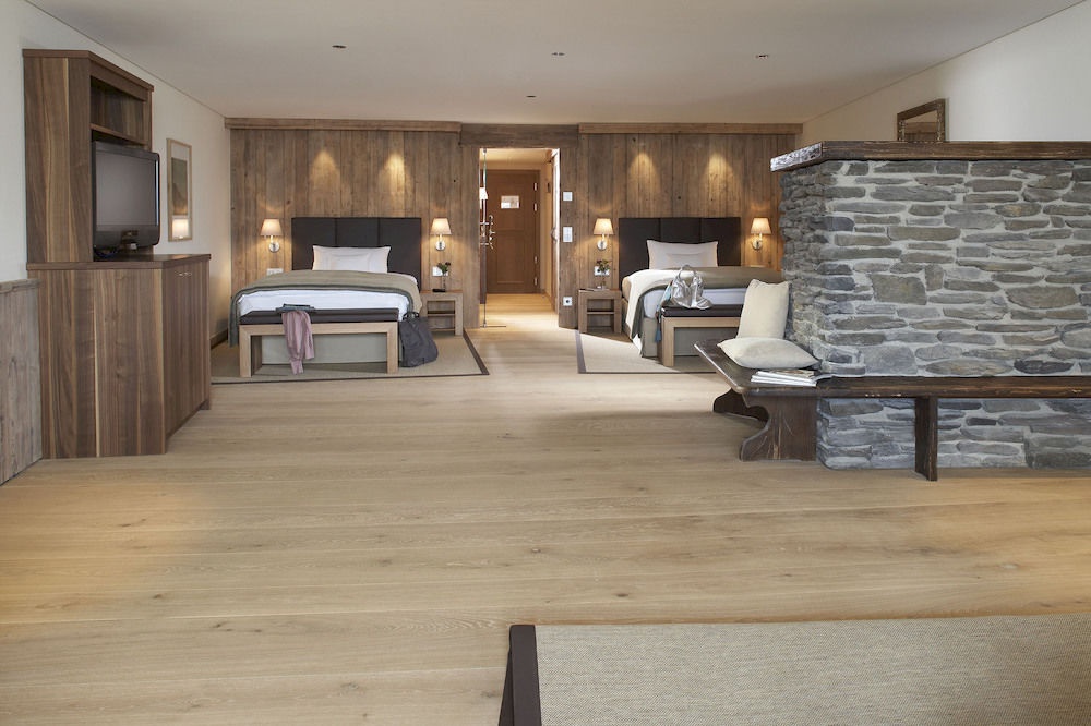Suite II: 107 м2. Просторные номера в альпийском стиле, состоят из: прихожей, 2 спален, 2 отдельных гостиных, одна из которых — с тирольской печью, 2 ванных комнат с ванной и душем, 2 отдельных туалетных комнат, балкона и собственной террасы с шезлонгами для принятия солнечных ванн. Максимальное размещение — 4 человека.