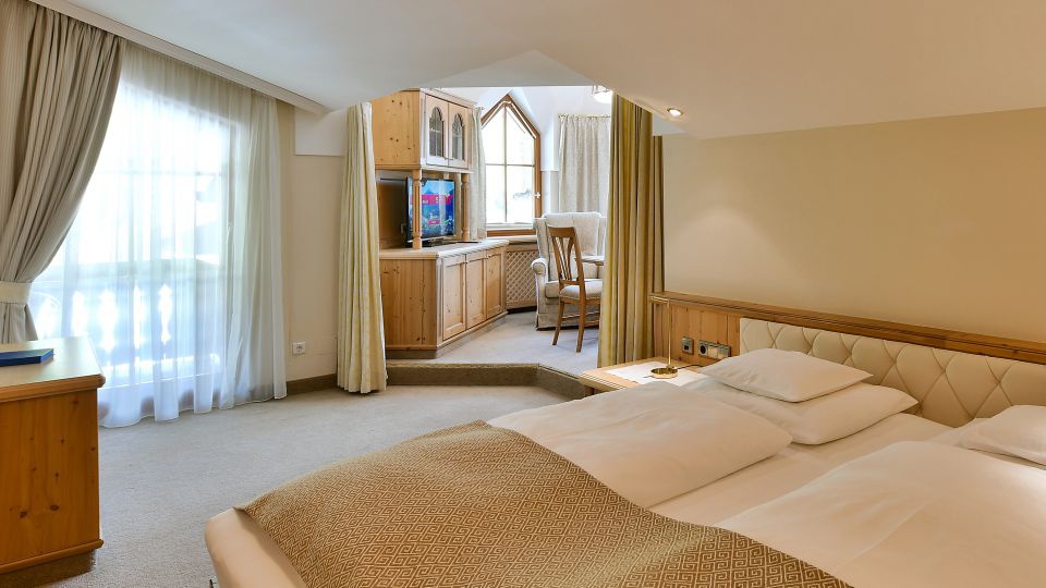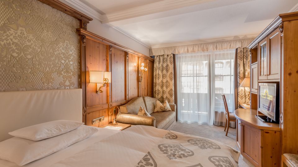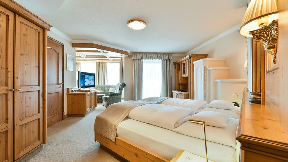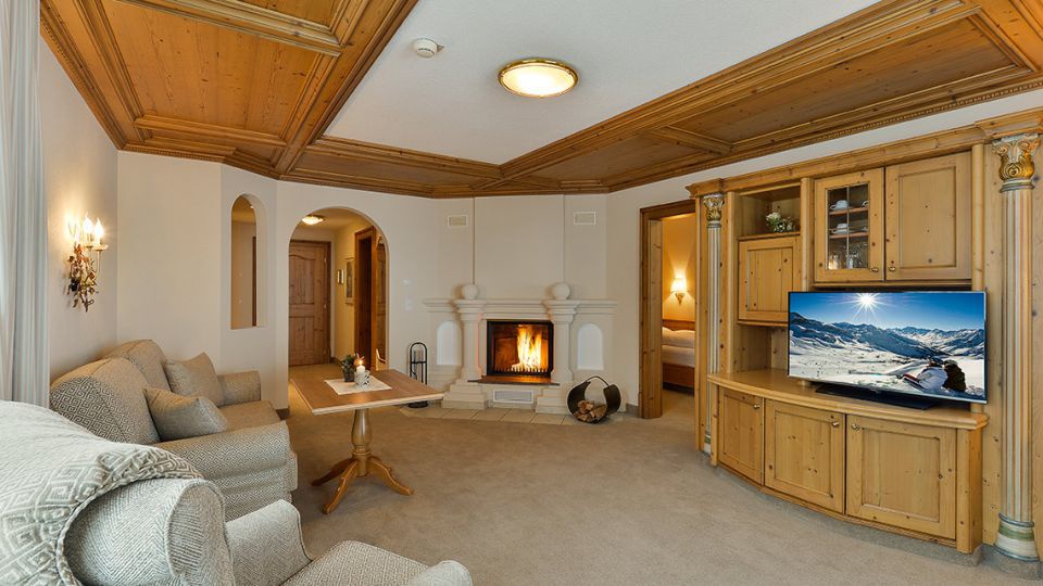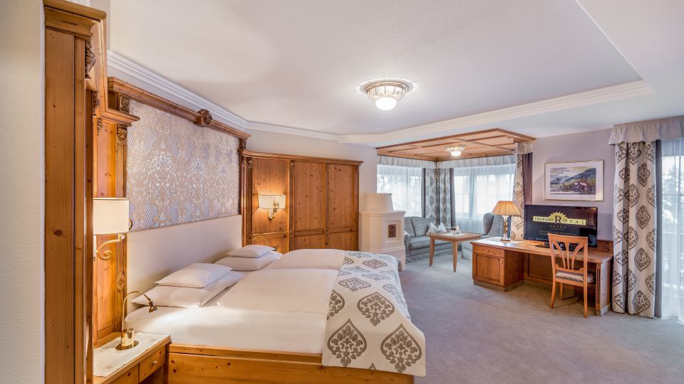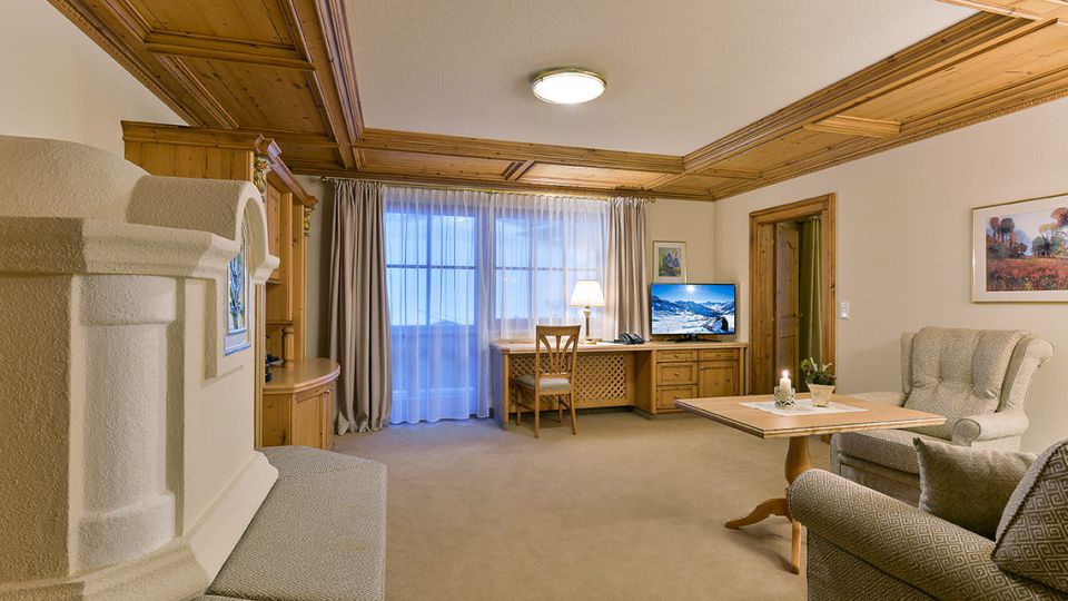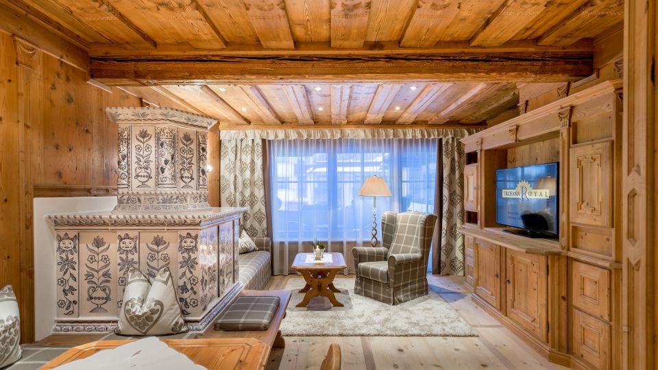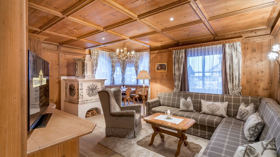 Роскошный люкс площадь, которой 90 кв.м., оформлен в аутентичном австрийском стиле с резной мебелью и оригинальной тирольской печью. Две отдельные спальни имеют индивидуальные просторные ванные комнаты. В дизайне использованы приглушенные пастельные тона и аутентичные узоры.