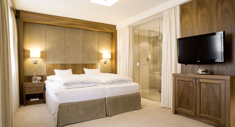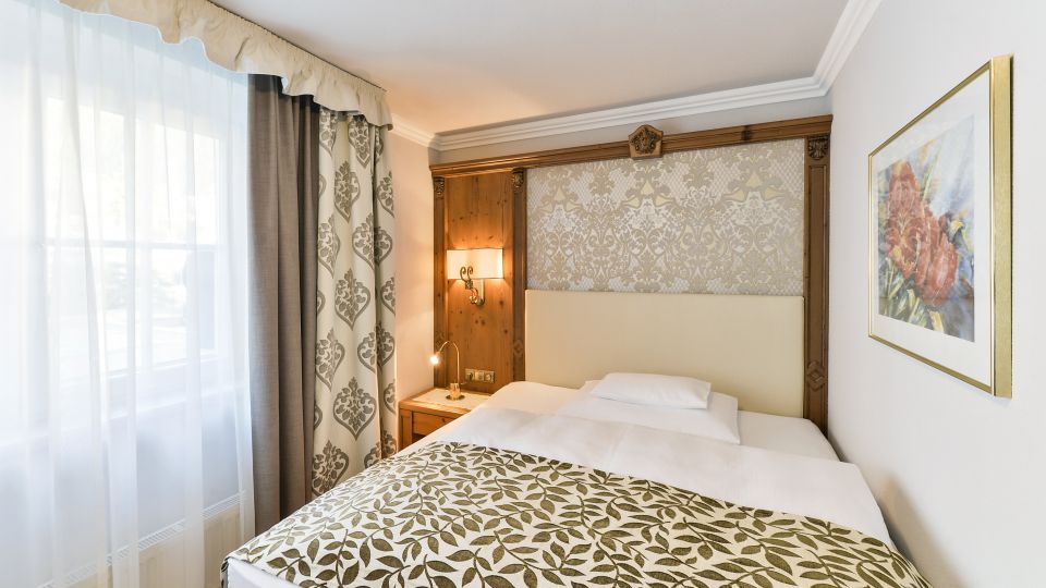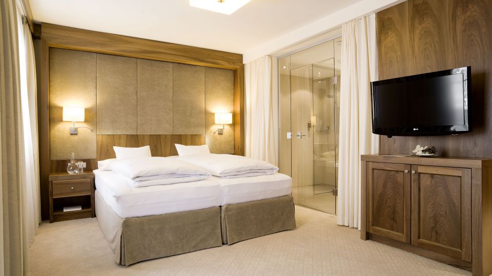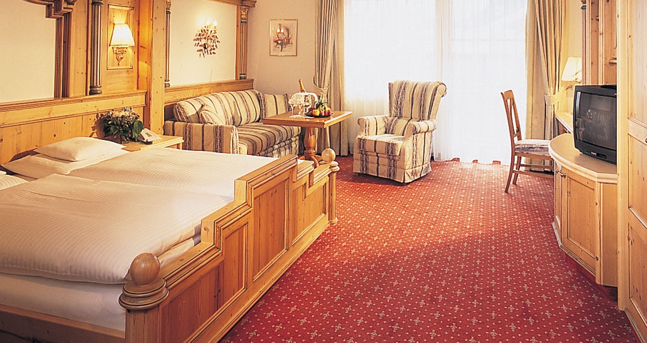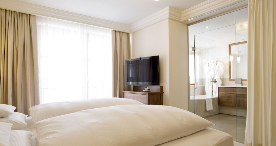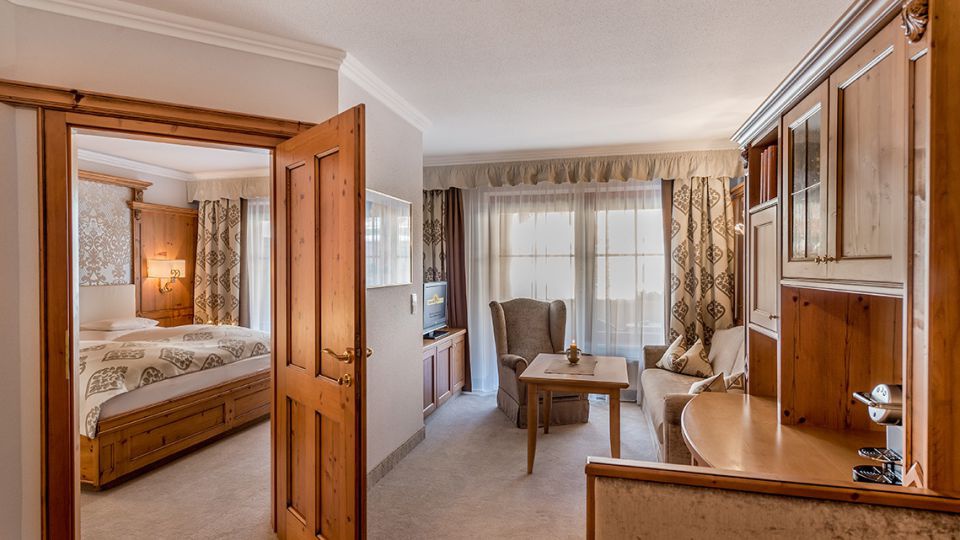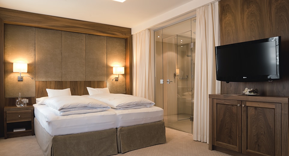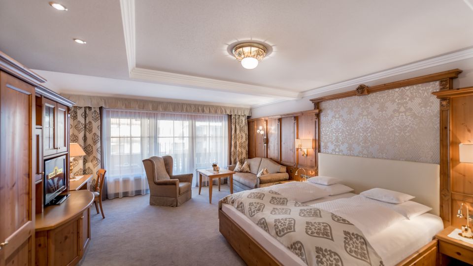 Роскошный люкс площадь, которой 90 кв.м., оформлен в аутентичном австрийском стиле с резной мебелью и оригинальной тирольской печью. Две отдельные спальни имеют индивидуальные просторные ванные комнаты. В дизайне использованы приглушенные пастельные тона и аутентичные узоры.