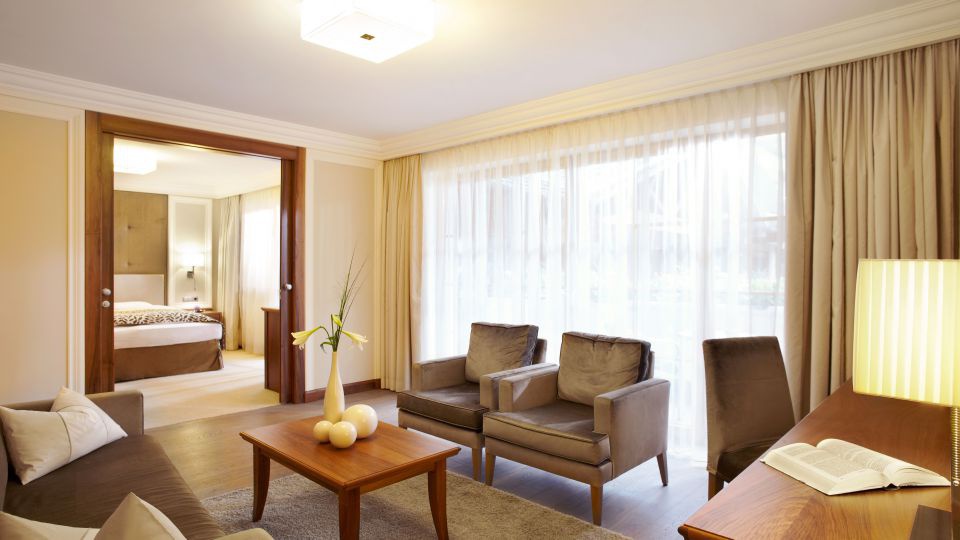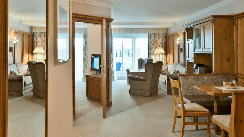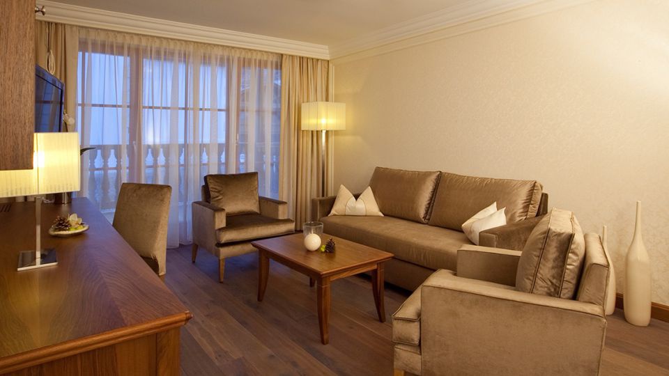 Площадь этого элегантного люкса 70 кв.м. При оформлении номера за основу был взят традиционный австрийский стиль. В зависимости от того, где размещены апартаменты, они могут иметь балкон с прекрасным видом или террасу с выходом в сад. Номер разделен на гостиную, обеденную и спальную зоны.