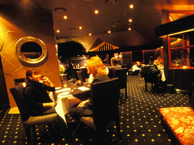 Каменные стены, открытый камин и темные драпировочные ткани, зеркала в позолоченных рамах и большие столы, покрытые накрахмаленными скатертями, создают общую атмосферу ресторана.