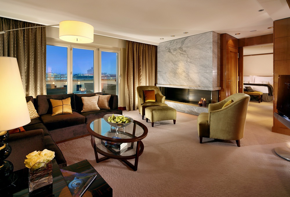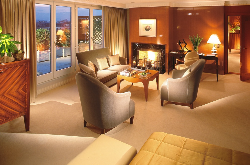 Junior Terrace Suite: 65 м2, расположен на последнем этаже, состоит из спальни с кроватью king-size, гостиной зоны с камином, ванной комнаты, просторной террасы (20 м2) с видом на реку и город. Максимальное размещение — 3 человека.