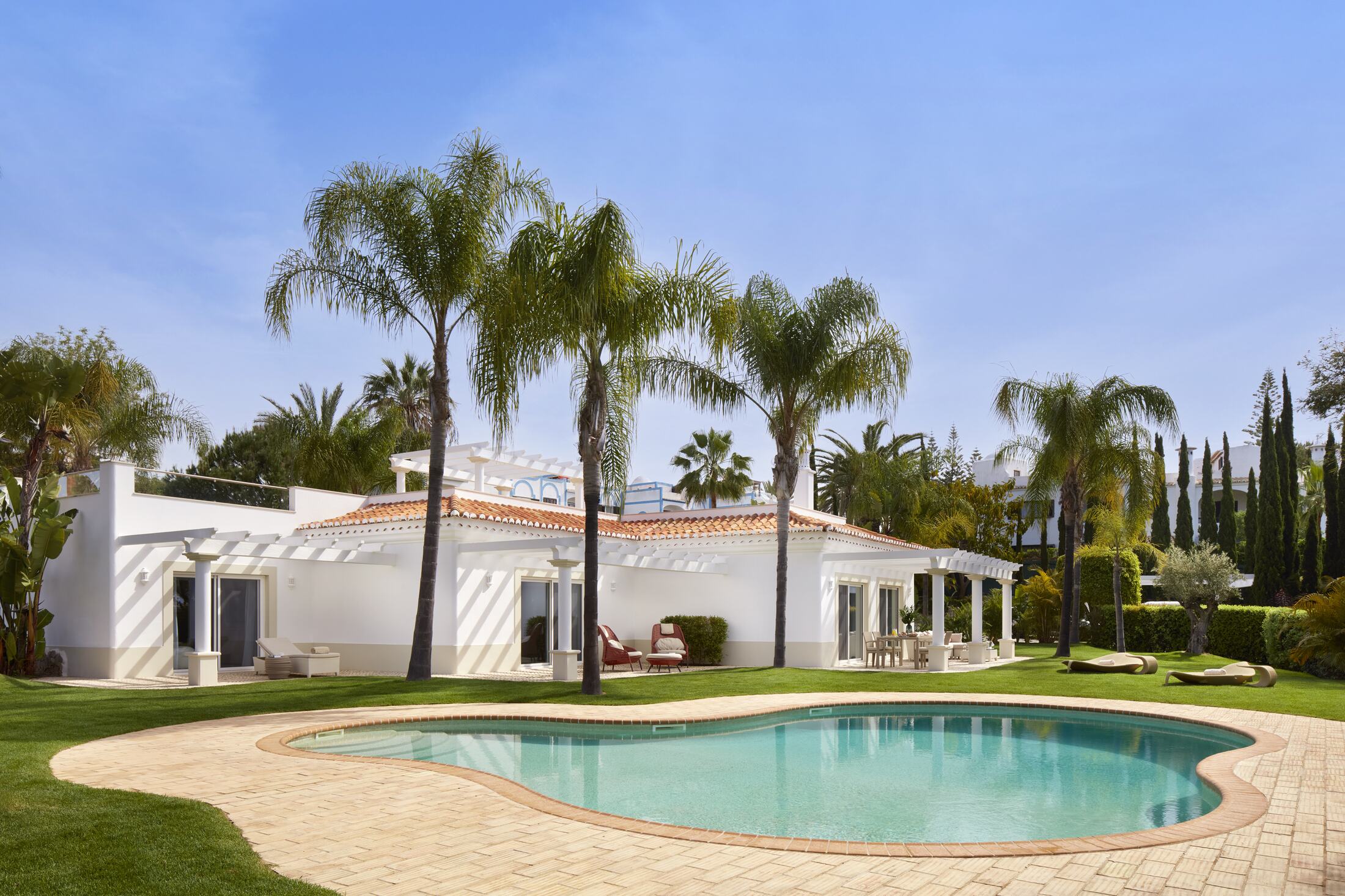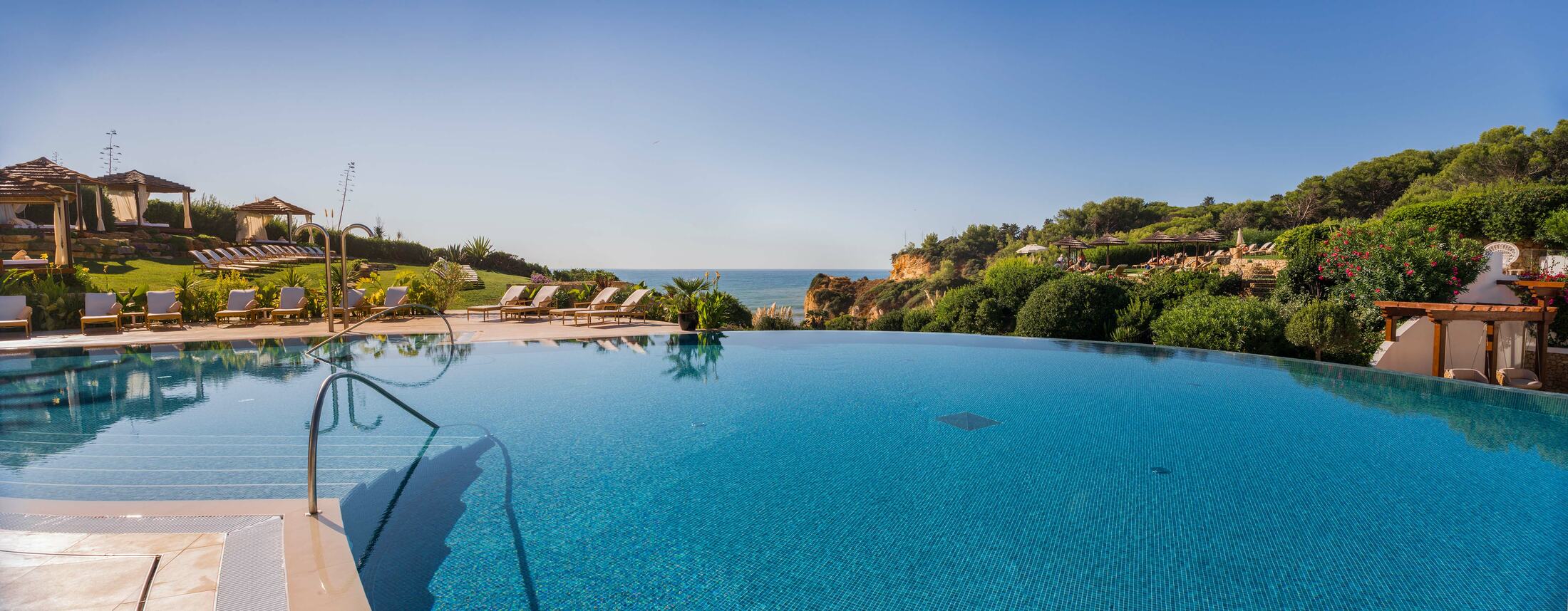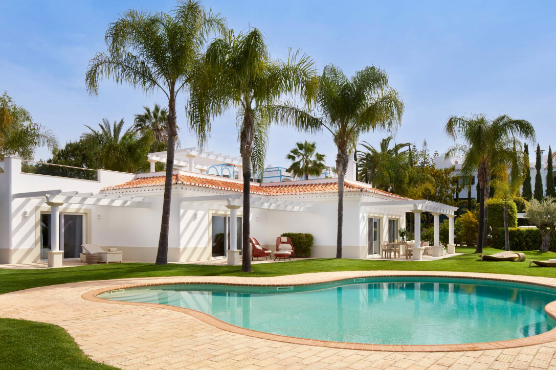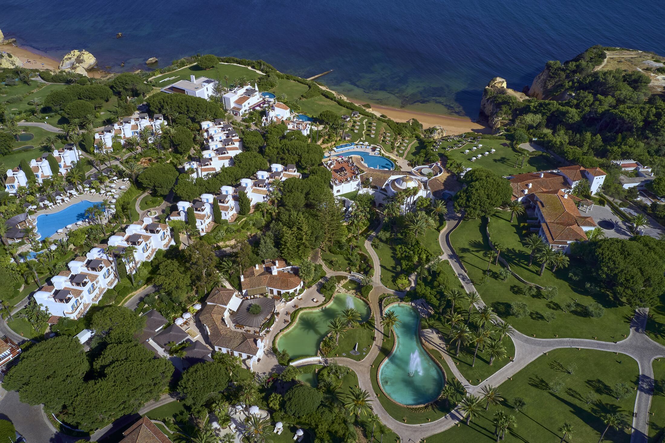 Vila Vita Parc Resort & Spa — это один из самых известных пятизвёздочных курортов Португалии, расположенный на побережье Атлантического океана в Алгарве, в районе Porches/Alporchinhos. Курорт занимает 22 гектара тропических садов и парковых территорий, что создаёт ощущение уединённой, зелёной оазисной территории прямо у океана. Архитектурный стиль отеля отражает мавританские влияния и характерную для Алгарве эстетику, сочетающую белоснежные фасады, терракотовые крыши, арки и цветочные акценты. При этом дизайн интерьеров — современный, элегантный и функциональный, с использованием натуральных материалов, высококлассной мебели и авторских деталей. Курорт широко известен своей разнообразной инфраструктурой: от просторных номеров и вилл с видом на океан до многочисленных ресторанов, спа-центра, активных спортивных и развлекательных зон. Здесь удачно сочетаются атмосфера роскоши, семейный отдых, романтика и деловые возможности, обеспечивая высокий уровень сервиса и персонализированный подход к гостю.