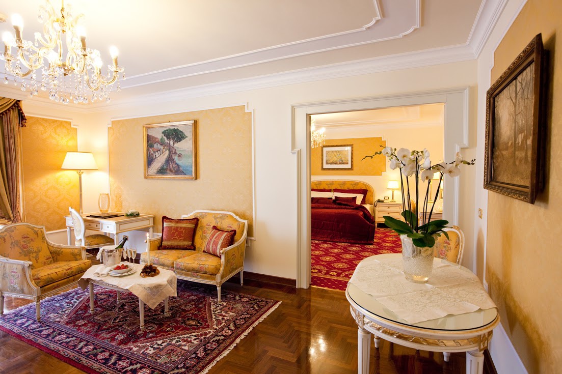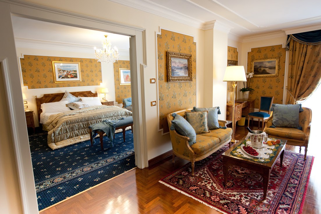 Изысканные двухкомнатные сьюты общей площадью 90 кв м, интерьер в стиле Людовика XVI, просторные ванные комнаты, облицованные итальянским мрамором, с ванной и душевой кабиной. Небольшая отдельная гардеробная; гостиная с паркетным полом и декоративным камином; спальня, отделенная от гостиной дверью.