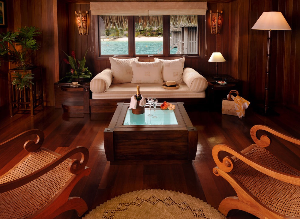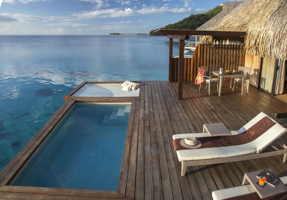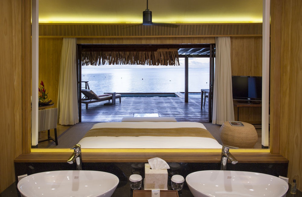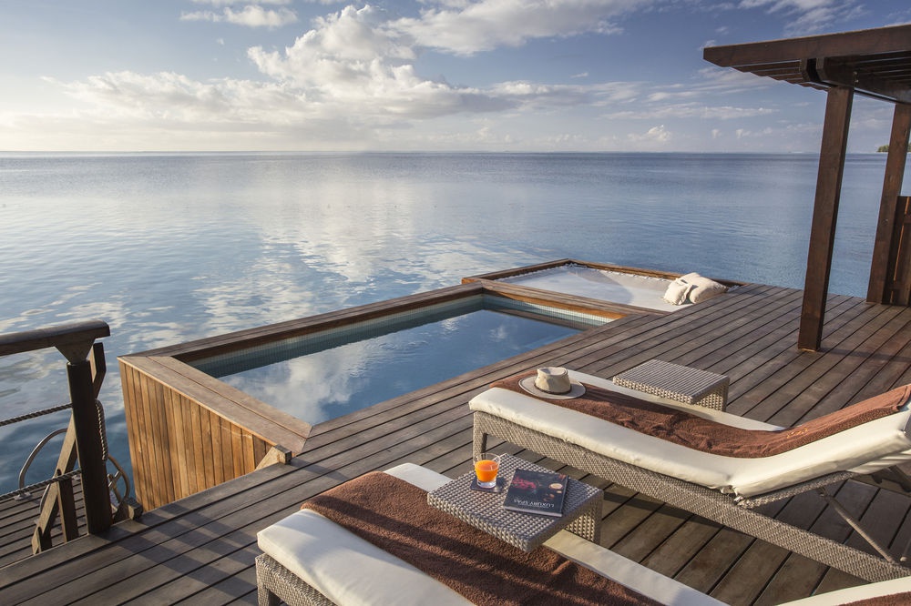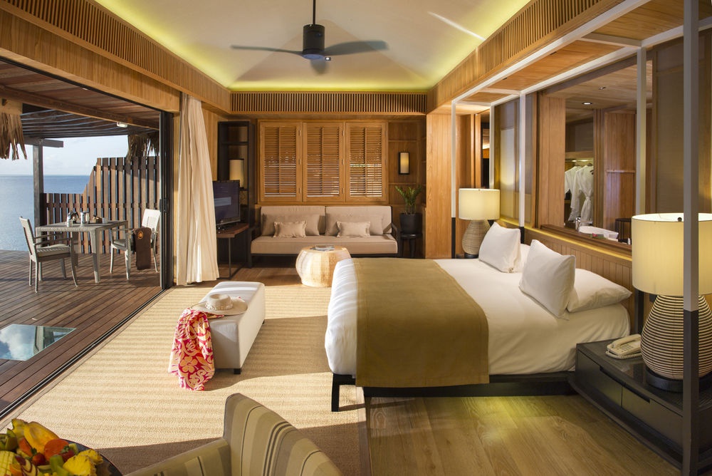 Overwater Villa: расположена на сваях над лагуной; состоит из спальни, гостиной, ванной комнаты, балкона.