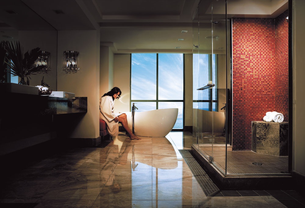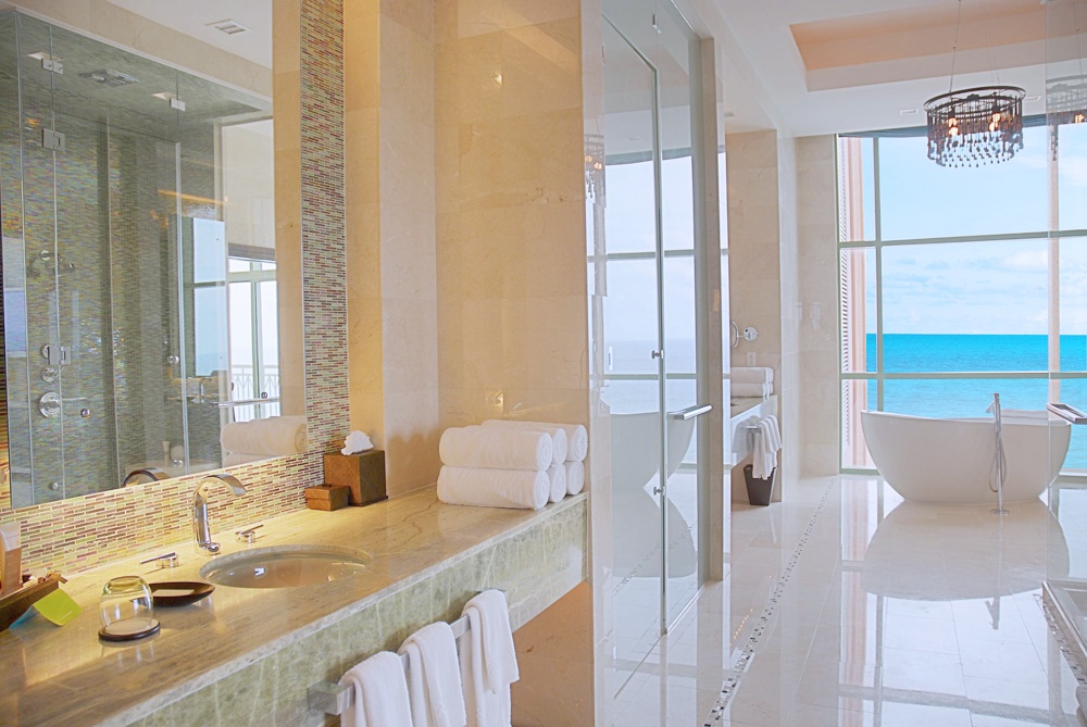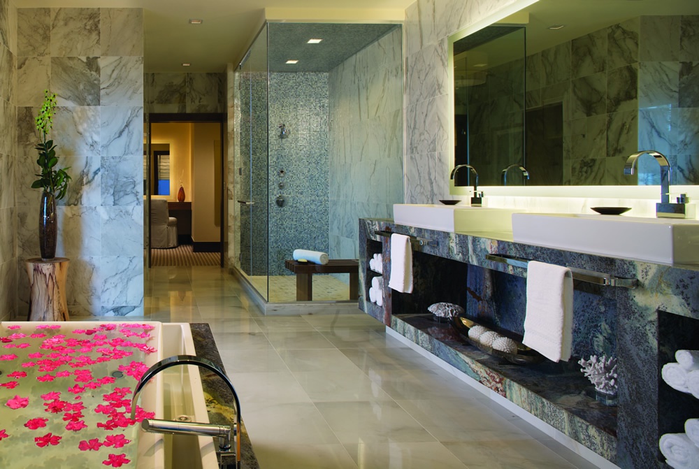 Ocean Suite 62,4 м2; состоит из спальни с кроватью king size, ванной комнаты с двумя туалетными столиками, ванной, душевой кабиной для двоих, с видом на море.