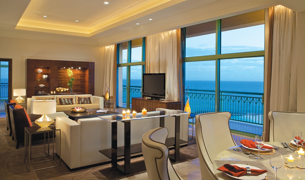 Penthouse Suite 371 м2; имеет 2 уровня, состоит из двух спален с фирменными кроватями Atlantean size, двух ванных комнат, просторной гостиной, столовой, сервированной на 10 человек, комнаты для просмотра фильмов с плоским телевизором с диагональю 60 дюймов, полностью оборудованной кухни, балконов с панорамными видами на море. В номере — роскошный дизайн, стильная мебель, арочные потолки.