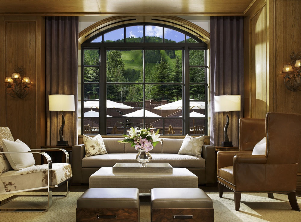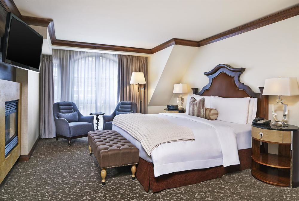 One Bedroom Suite: 76 м2. Состоит из спальни с кроватью king-size, гостиной с камином и раскладным диваном со спальным местом queen-size, ванной комнаты с ванной, душем и двумя раковинами. Вид на горы, внутренний двор отеля или Аспен.