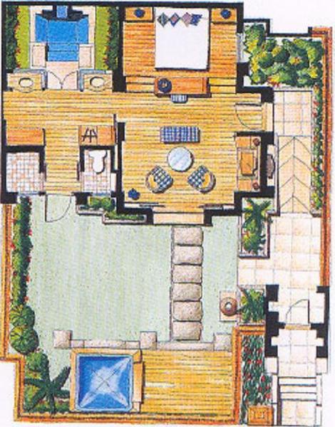 Two Bedroom Pool Villa: (350 кв.м) — состоит из гостиной с обеденной зоной, 2 спален с ванными комнатами (одна – с двумя отдельными кроватями), гардеробных, кухни, террасы с садом, зоной отдыха, джакузи и бассейном (3,5м х 9м).