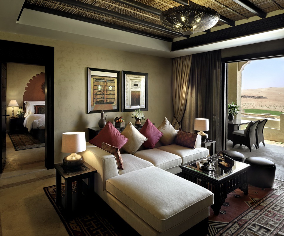 В отеле 206 комфортабельных номеров следующих категорий: 70 Deluxe Rooms, 42 Deluxe Balcony Rooms, 28 Deluxe Terrace Rooms, 14 One-Bedroom Suites, 52 Villas (One-Bedroom Villa, Two-Bedroom Villa, Three-Bedroom Villa). В номерах, выполненных в теплых золотисто-коричневых тонах, — роскошные интерьеры с изысканным арабским декором: высокие деревянные потолки, ковры с традиционным орнаментом, мебель из дорогих пород темного дерева, серебряные и бронзовые светильники; террасы/балконы с удивительными видами на сад отеля и на пустыню Liwa.