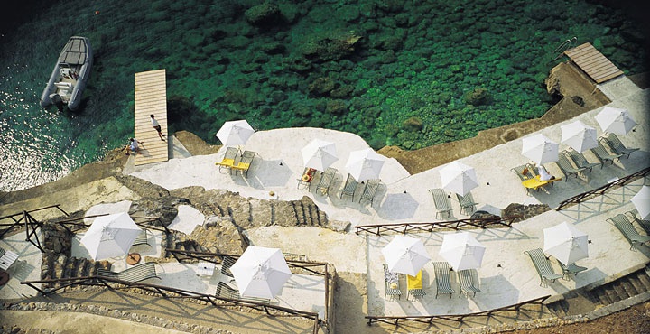 Гостиничный комплекс состоит из нескольких коттеджей и центрального здания, в котором размещаются приемная, бар, ресторан "Il Pellicano", винный погреб "Il Puttino Baccante", магазин, конференц-зал, спа-центр и спортивный зал. В летний сезон работают бар и ресторан под открытым небом, обращенные на подогреваемый плавательный бассейн с морской водой и побережье. Кроме того, отель располагает небольшим скалистым пляжем, куда можно спуститься прямо на лифте.