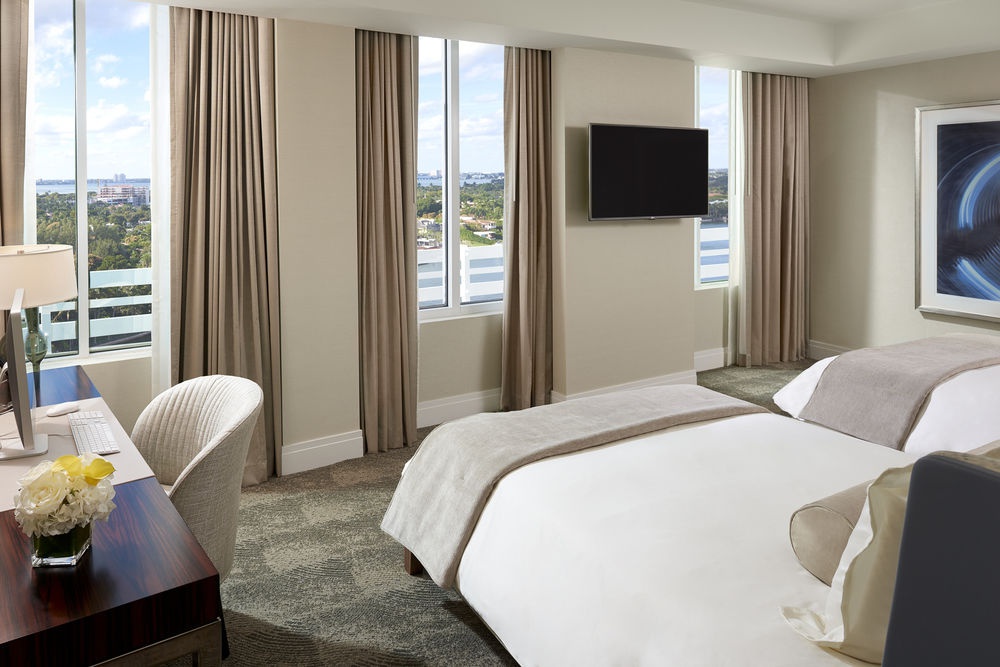 Deluxe Bay View Guestroom: 25-27 м2. Состоит из спальни с кроватью king-size или двумя кроватями queen, ванной комнаты, вид на залив Бискейн или центр Майами.