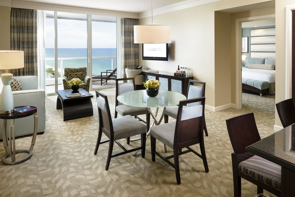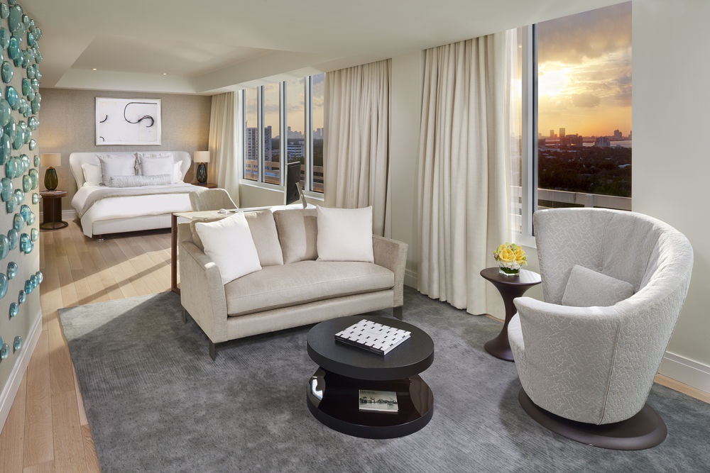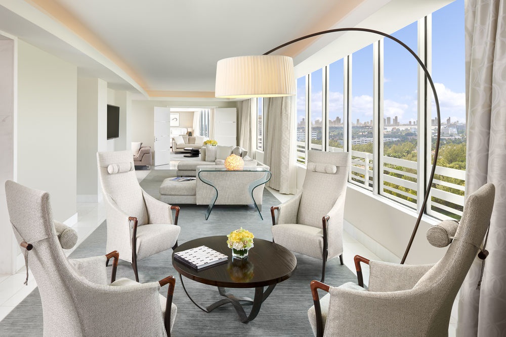 La Baie Presidential: 218-223 м2. Элегантный номер на верхнем этаже исторического здания Chateau, включает гостиную с баром, обеденную зону на 10 персон, 2 спальни (с кроватью king и queen-size), 2 ванные комнаты, панорамный вид на залив Бискейн и центр Майами.