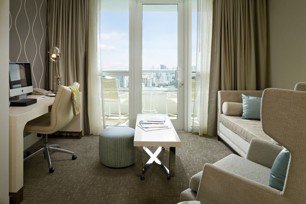 Tresor Bay View Junior Suite: 40-46 м2. Расположен в здании Tresor, состоит из спальни, гостиной зоны, уголка для разогрева пищи с мини-холодильником, микроволновой печью и мойкой, ванной комнаты, балкона с видом на залив Бискейн или Майами.