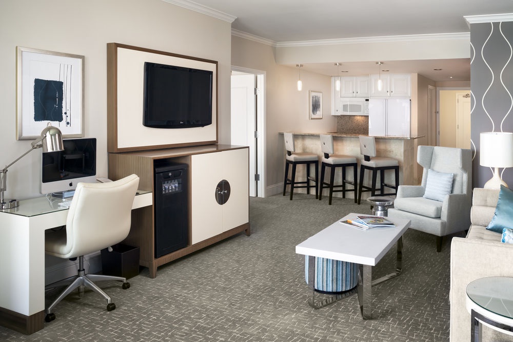 One Bedroom Hospitality Suite: просторный номер с гостиной, спальней и ванной комнатой.