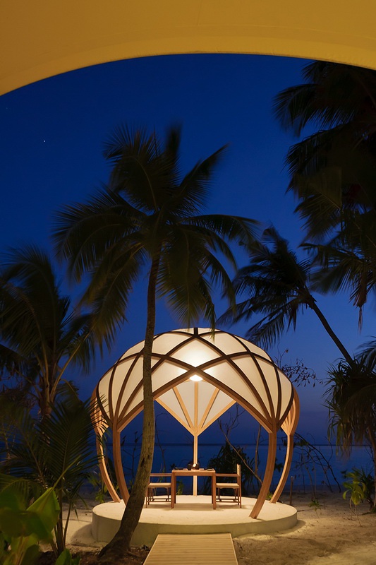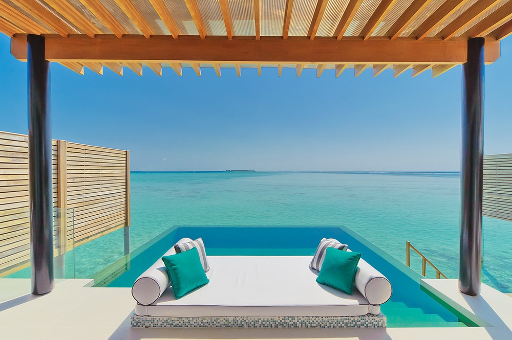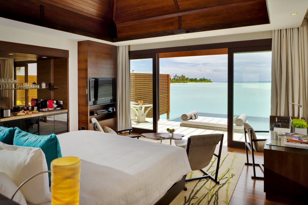 340 м². Павильон над водой с бассейном для двух взрослых со спальней, собственным бассейном, джакузи под открытым небом, собственной террасой с шезлонгами, кушеткой и обеденным столом, ступенями, ведущими с индивидуальной террасы прямо в лагуну, гостиной и обеденной зоной, ванной в помещении с душами, расположенными внутри и частично снаружи, ЖК-телевизором, кладовой дворецкого с дополнительным холодильником, льодогенератором, микроволновой печью и холодильником для вина, буфетом, заполненным напитками и закусками. Доступен массаж ног по прибытии и ежедневная доставка свежих кокосов и сумки-холодильника с прохладными полотенцами для лица.