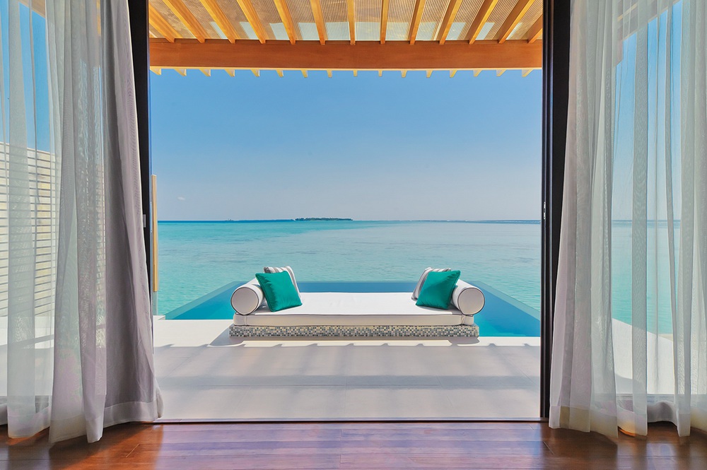 515 м². Павильон с двумя спальнями и бассейном над океаном для 4-х взрослых или 2-х взрослых + 2 детей, погруженной в воду гостиной, собственным бассейном, джакузи под открытым небом, собственной террасой с плавающими шезлонгами, креслами и обеденным столом, закрытой ванной с душами, расположенными внутри и снаружи, ЖК-телевизором, кладовой дворецкого с дополнительным холодильником, льодогенератором, микроволновой печью и холодильником для вина, буфетом, заполненным напитками и закусками. Прямой выход в океан. Доступен массаж ног по прибытии и ежедневная доставка свежих кокосов и сумки-холодильника с прохладными полотенцами для лица.