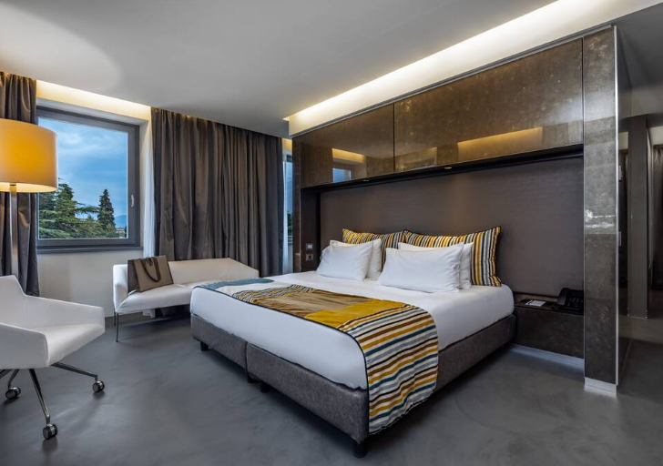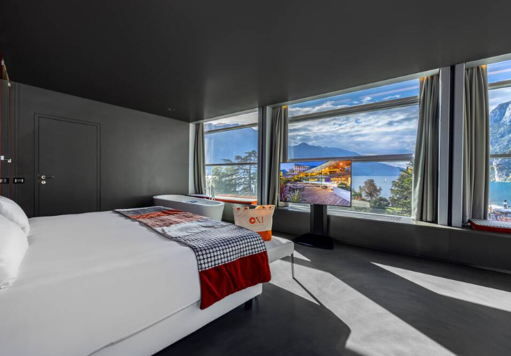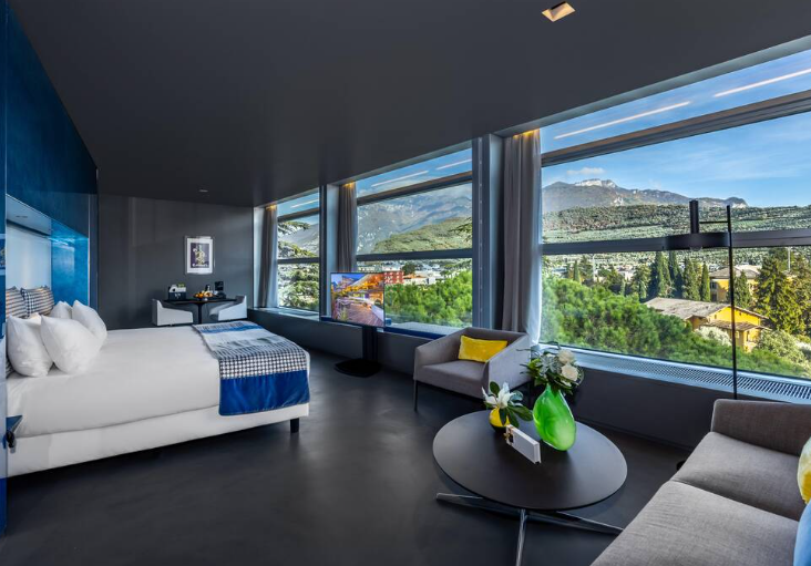 Эти очень просторные люксы класса люкс расположены на верхнем этаже отеля и выходят окнами на озеро Гарда. Великолепная панорама сочетается с великолепным декором, в котором преобладают со вкусом подобранные красные штрихи и современная дизайнерская мебель. В этих люксах есть отдельная гостиная и солнечная терраса. В спальне, возле окна, также есть ванна. 4 гостя, 120 м²