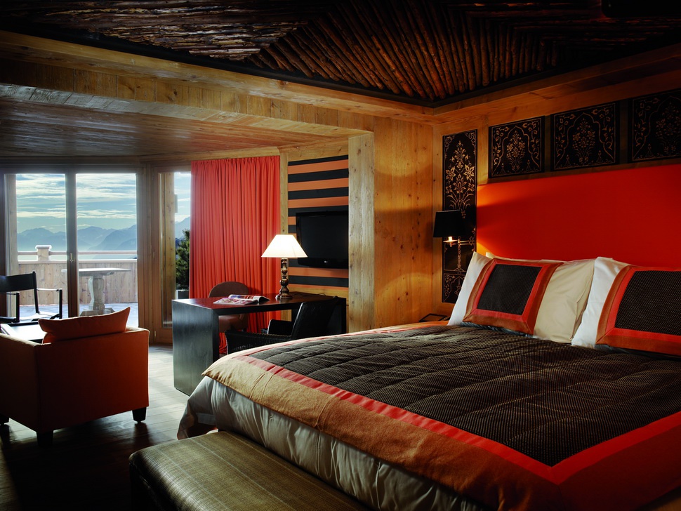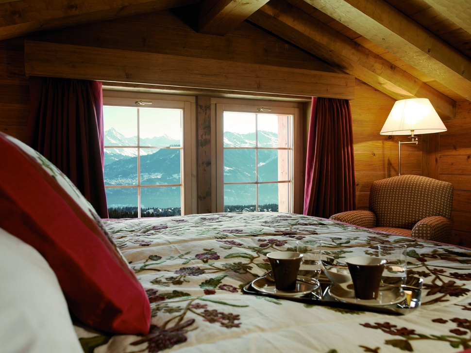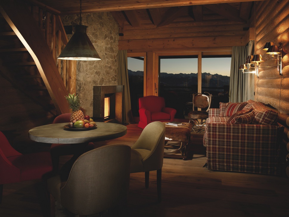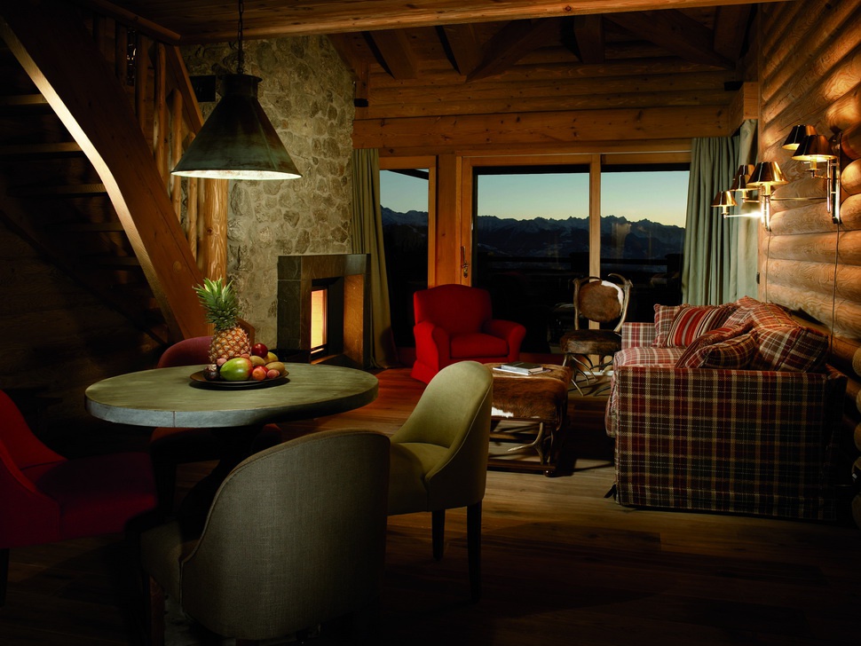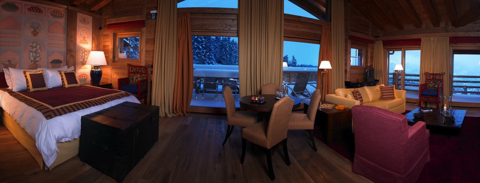 Alpes Deluxe Suite: 70 м2. Шикарный двухуровневый номер, выполненный в традиционном альпийском стиле, отделан сосновым деревом 150-летнего возраста и дорогими тканями в зеленых, красных и кремовых тонах. Состоит из гостиной, спальни (на 2 этаже), ванной комнаты, террасы с захватывающим видом на вершины долины Вале.