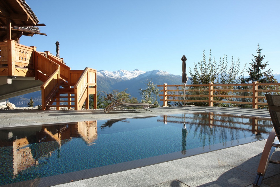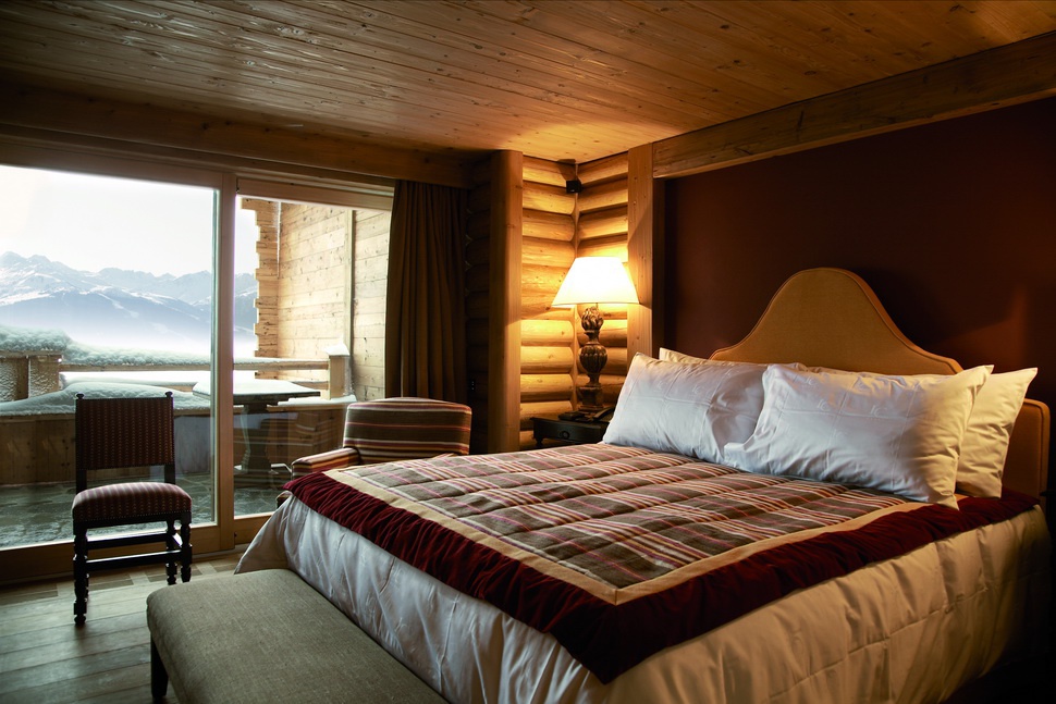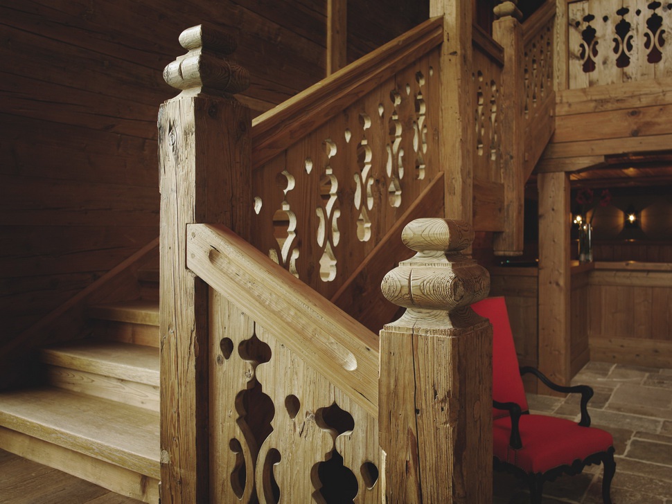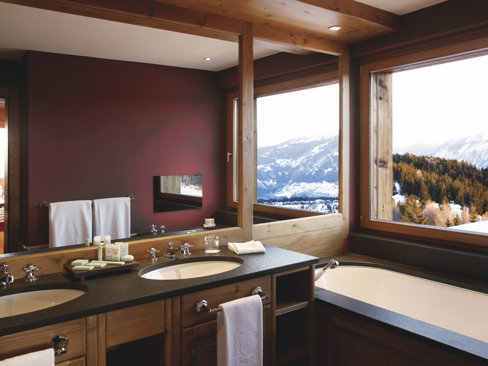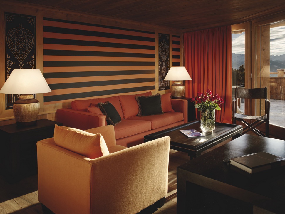 Alpes Deluxe Suite: 70 м2. Шикарный двухуровневый номер, выполненный в традиционном альпийском стиле, отделан сосновым деревом 150-летнего возраста и дорогими тканями в зеленых, красных и кремовых тонах. Состоит из гостиной, спальни (на 2 этаже), ванной комнаты, террасы с захватывающим видом на вершины долины Вале.