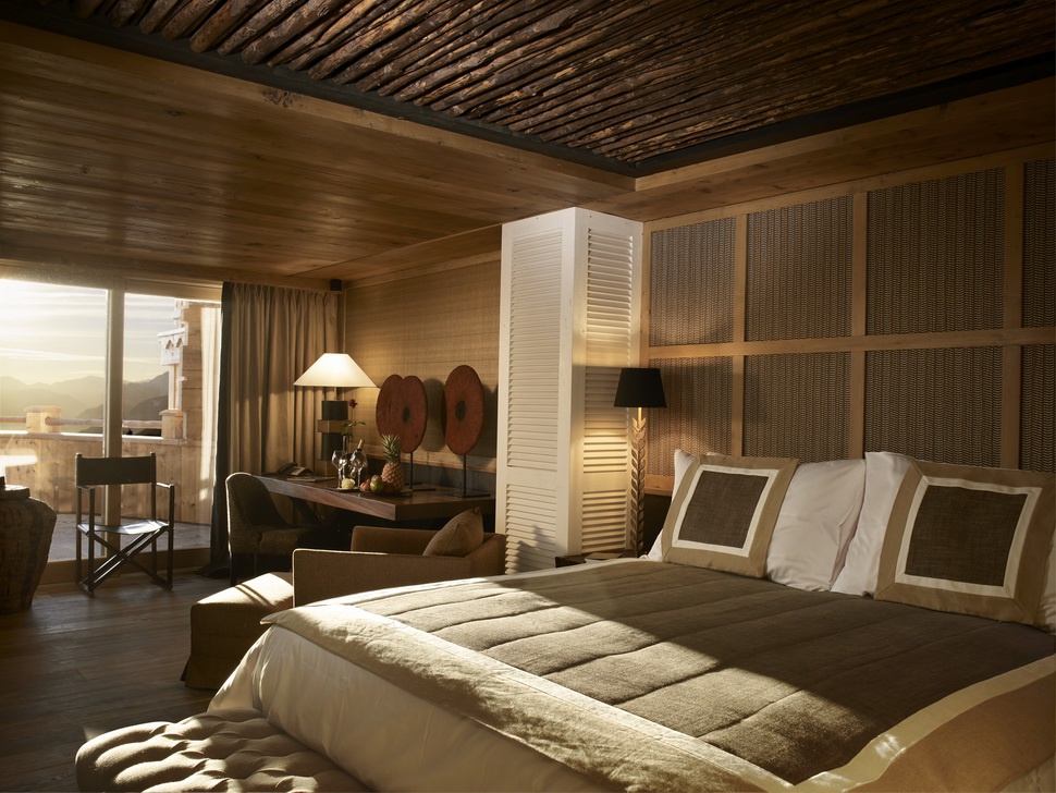 Annapurna Junior Suite: 45-60 м2. Элементы декора отражают восточный стиль (вершина Аннапурна расположена между Тибетом и Непалом), мебель выполнена в золотисто-бордовых тонах. Состоит из спальни, гостиной зоны, ванной комнаты, просторной террасы с видом на горы.