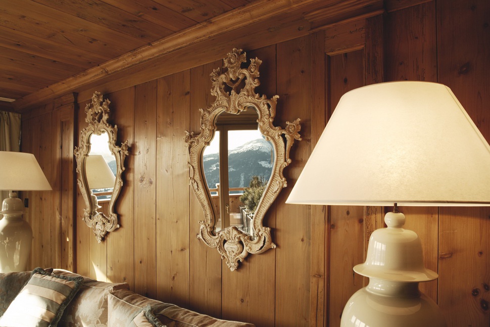 Dolomites Junior Suite: 45-60 м2. Интерьер номера воссоздает элегантный итальянский дизайн и изысканные элементы в традициях венецианского дворца: изящная мебель в стиле эпохи Ренессанса, великолепные витые рамы с зеркалами, в которых отражаются заснеженные вершины Альп. Состоит из спальни, гостиной зоны, ванной комнаты, просторной террасы с видом на горы.
