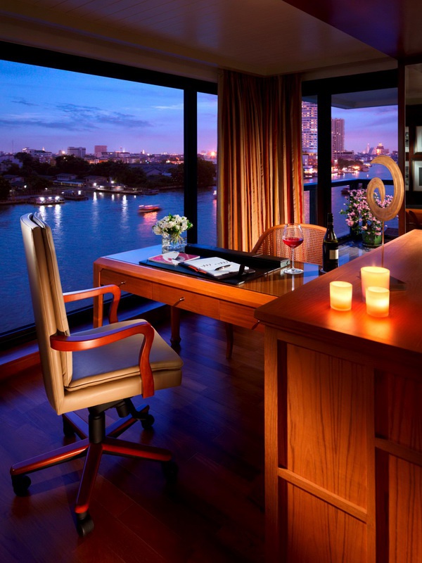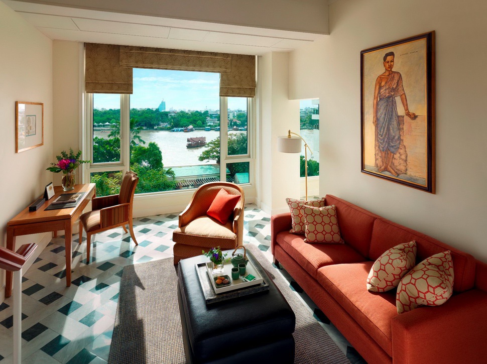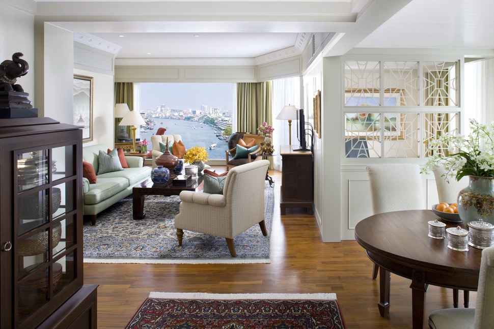 Siam Suite: 130 м2. Расположен на последнем этаже основного крыла River Wing, оформлен в роскошном стиле северного Таиланда, обставлен антикварной мебелью эпохи династии Chiang Mai, украшен современной тайской живописью и персидскими коврами, имеет панорамные, от пола до потолка окна, состоит из фойе, гостиной с обеденной зоной, 2 спален с двумя кроватями twin, ванной комнаты, имеет потрясающий панорамный вид на реку и город.