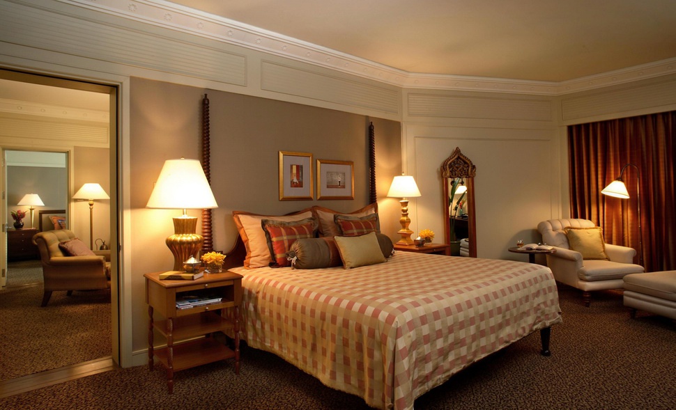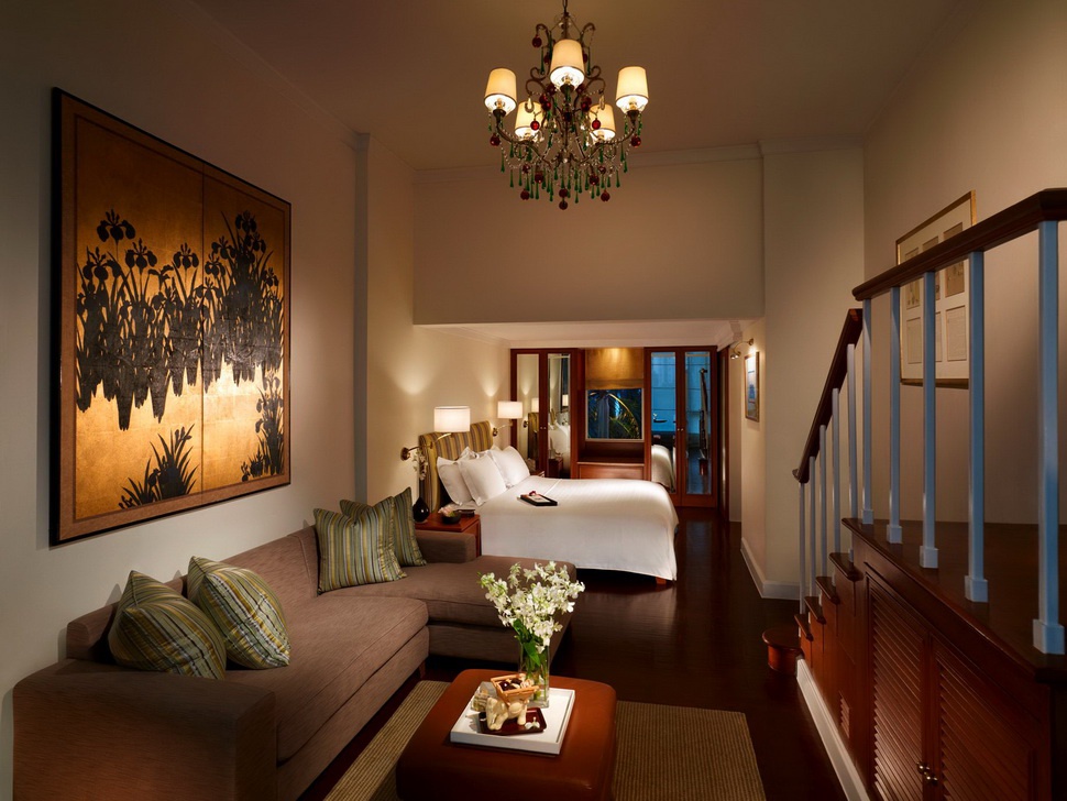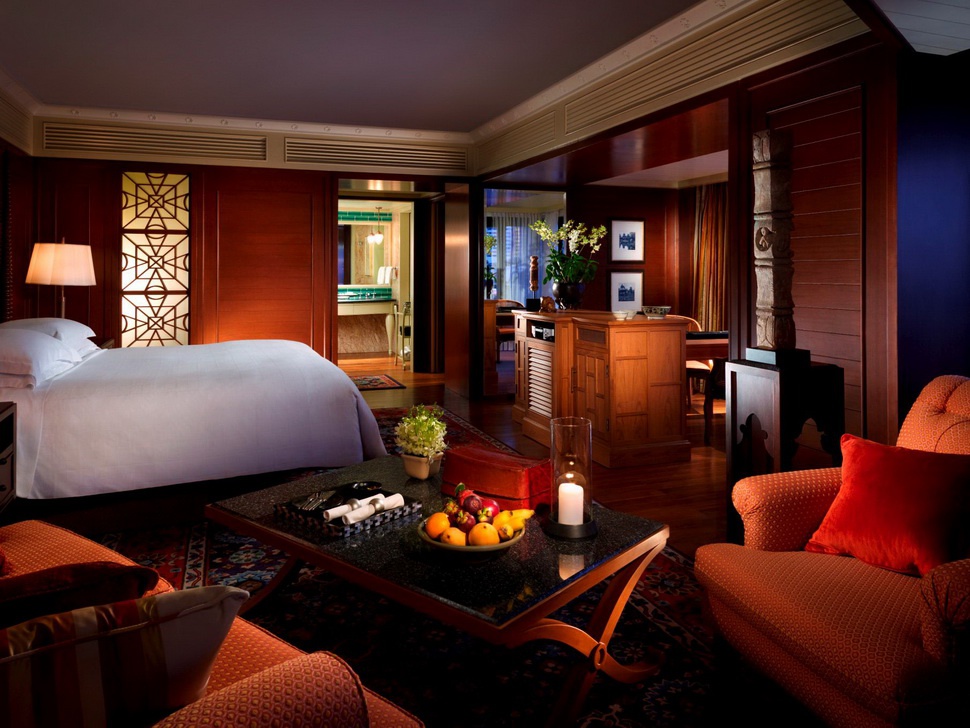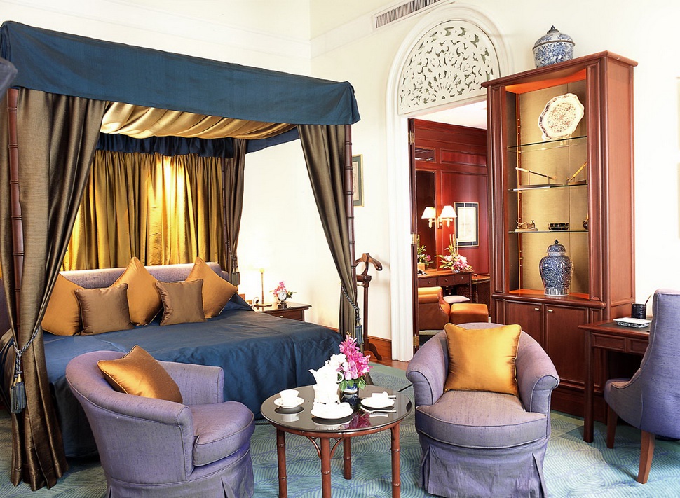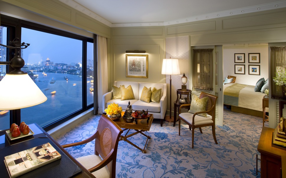 Deluxe Two-Bedroom Theme Suite: 125 м2. Расположен на 16 этаже крыла River Wing, великолепно декорирован, украшен персидскими коврами и инкрустированной бронзой тиковой мебелью, состоит из 2 спален (с кроватью king-size и двумя кроватями twin), гостиной зоны, ванной комнаты, имеет потрясающий панорамный вид на реку и город.