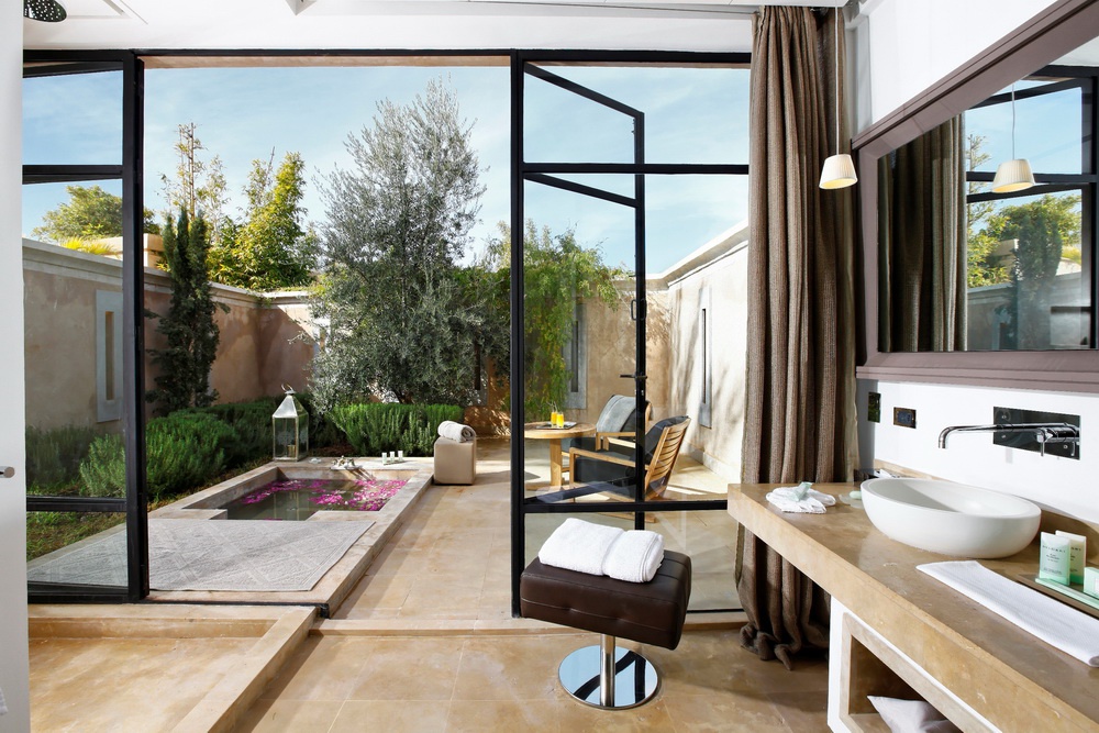 Pool Suite: 108 м2. Шикарный номер с отдельным входом, состоит из спальни с кроватью king-size и террасой с садом, гостиной с камином, гардеробной, ванной комнаты, душа на открытом воздухе, просторной террасы (180 м2) с зоной отдыха и персональным подогреваемым бассейном. Может соединяться с соседним номером и образовывать сьют с 2 спальнями.