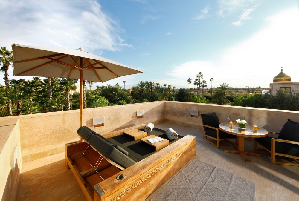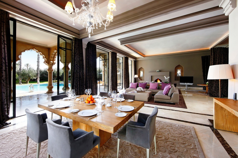 Mountain Palace: 460 м2. Роскошный двухэтажный дворец в восточном стиле, увенчанный золоченым куполом; включает 2 спальни с кроватями king-size, ванными комнатами и гардеробными, просторную гостиную с камином и обеденной зоной, кухню, террасу с видом на Атласские горы, пышный сад (2000 м2) с большим подогреваемым бассейном. Гостям предоставляются круглосуточные услуги персонального дворецкого.
