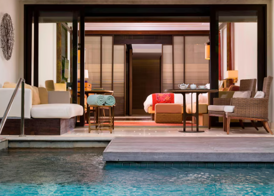 (97-110 кв. м): балкон с обеденной зоной, спальня с гостиной зоной (кровать king-size или две отдельные кровати), ванная комната с ванной и душем с функцией «тропический дождь», душ на открытом воздухе. Прямой выход к бассейну. Вид на сады, территорию отеля, прямой или частичный вид на океан.