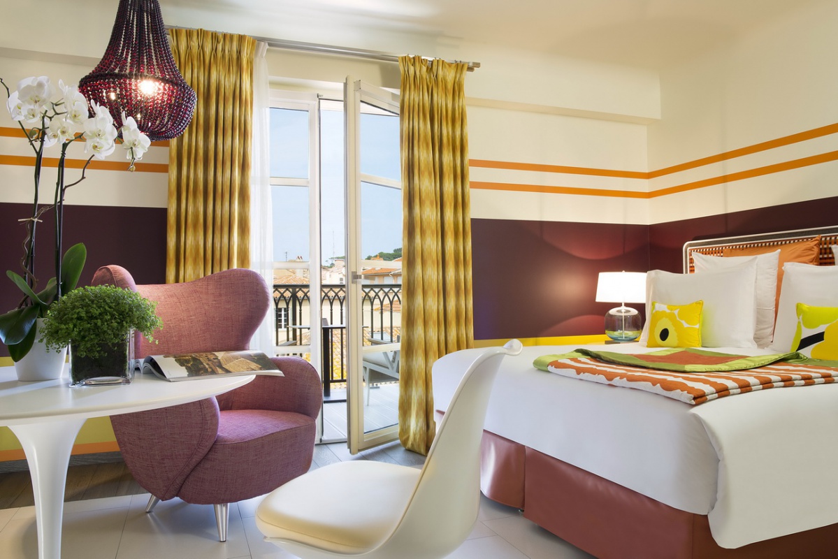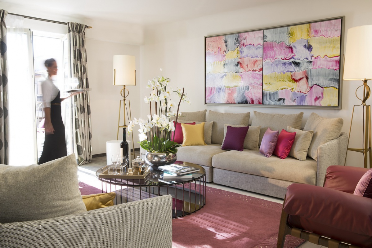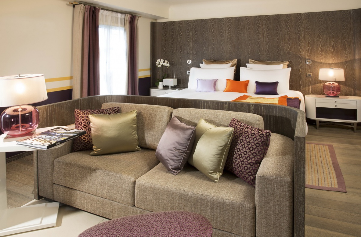 Цветовая гамма, представленная в дизайне номеров, завораживает. Чёткие геометрические линии оранжевых, лиловых, голубых и коричневых оттенков, создают особый контраст с современной белой лакированной мебелью, белоснежными деревянными, каменными или паркетными полами. В номерах Suite гармонично сочетаются детали из дерева и камня, и конечно, особый шарм номерам придает дизайнерская мебель с льняной и шелковой отделкой.
