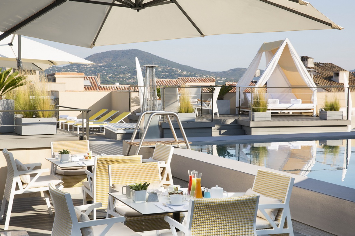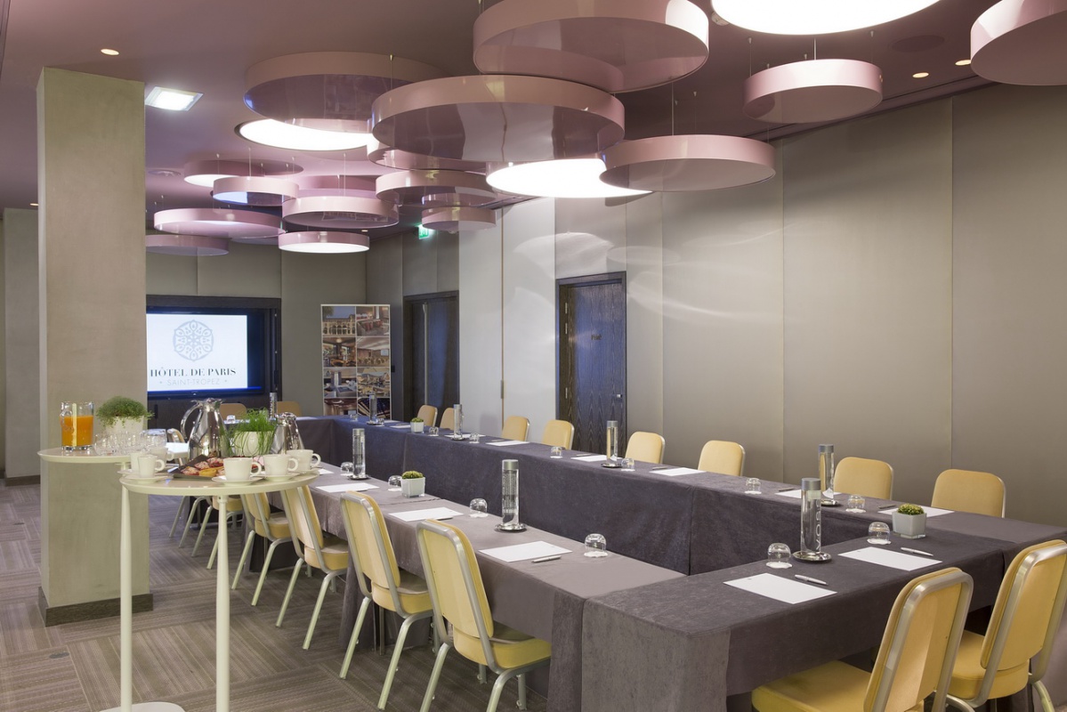 Hôtel de Paris — Saint Tropez, излюбленное место отдыха знаменитостей 60-х годов прошлого века, сегодня предлагает гостям роскошный современный декор, сочетающий яркие цветовые и графические решения с первоклассной отделкой из натуральных материалов. К услугам гостей: комфортабельные номера, где чёткие геометрические линии оранжевых, лиловых, голубых и коричневых оттенков, создают особый контраст с современной белой лакированной мебелью, белоснежными деревянными, каменными или паркетными полами, отличный СПА-центр, где предлагается широкий спектр услуг по уходу за телом и лицом с использованием косметики Clarins и My Blend, открытый бассейн уникального дизайна с прозрачным дном, расположенный на крыше отеля, на высоте 15 метров от пола, конференц-залы общей площадью 340 м2, которые идеальное подойдут как для частных, так и для корпоративных мероприятий, 2 ресторана, бар и кафе, предлагающие богатый выбор блюд средиземноморской и японской кухни, а также выбор эксклюзивных вин из частной коллекции отеля. Гости также могут насладиться прогулкой или трапезой в очаровательной обстановке внутреннего двора отеля.
