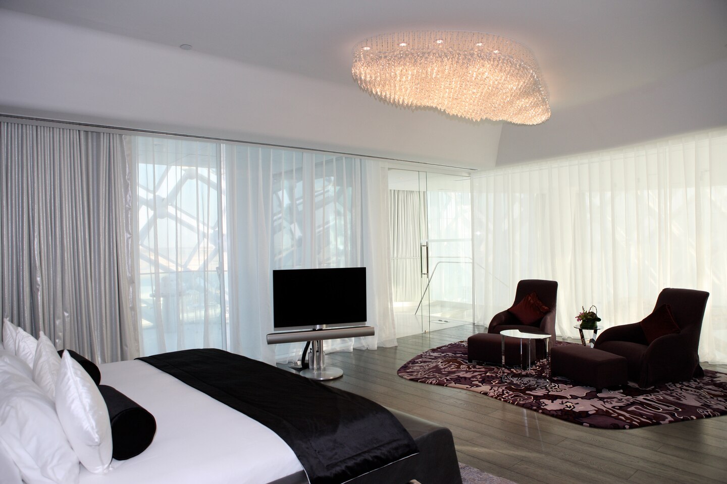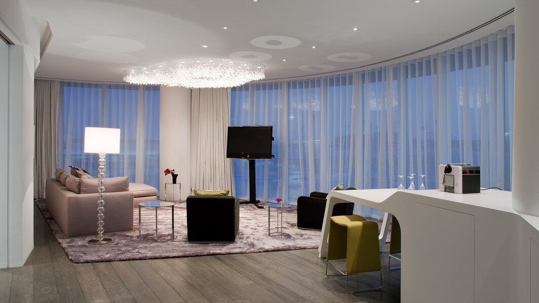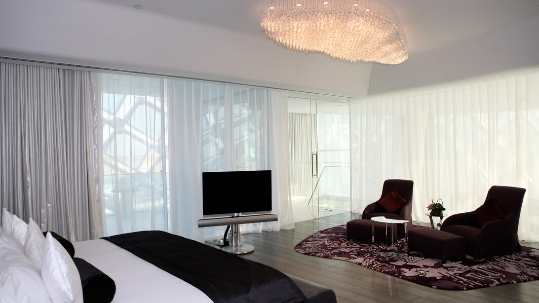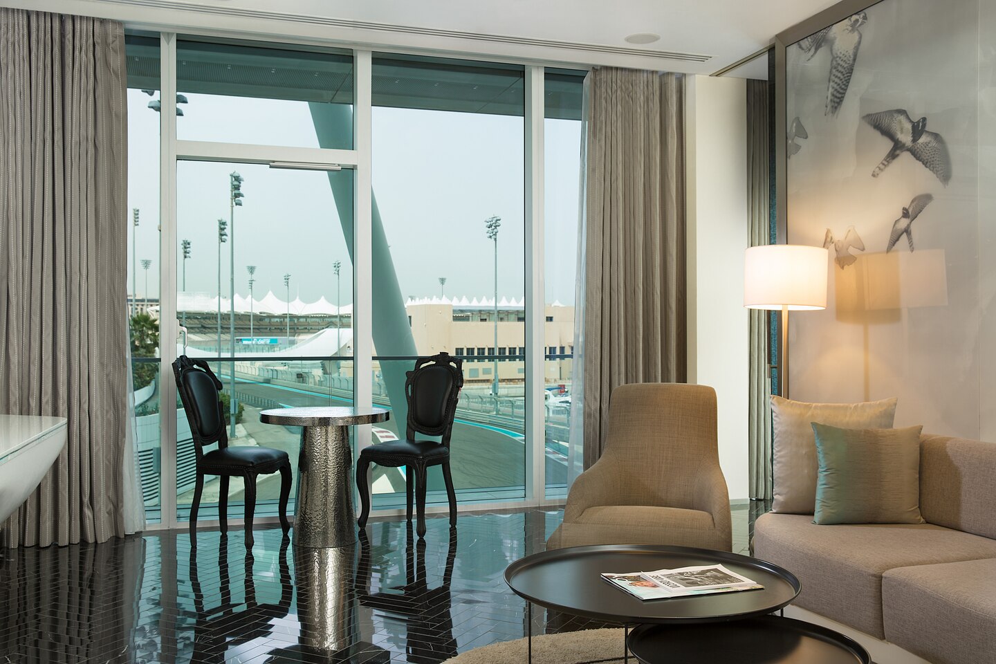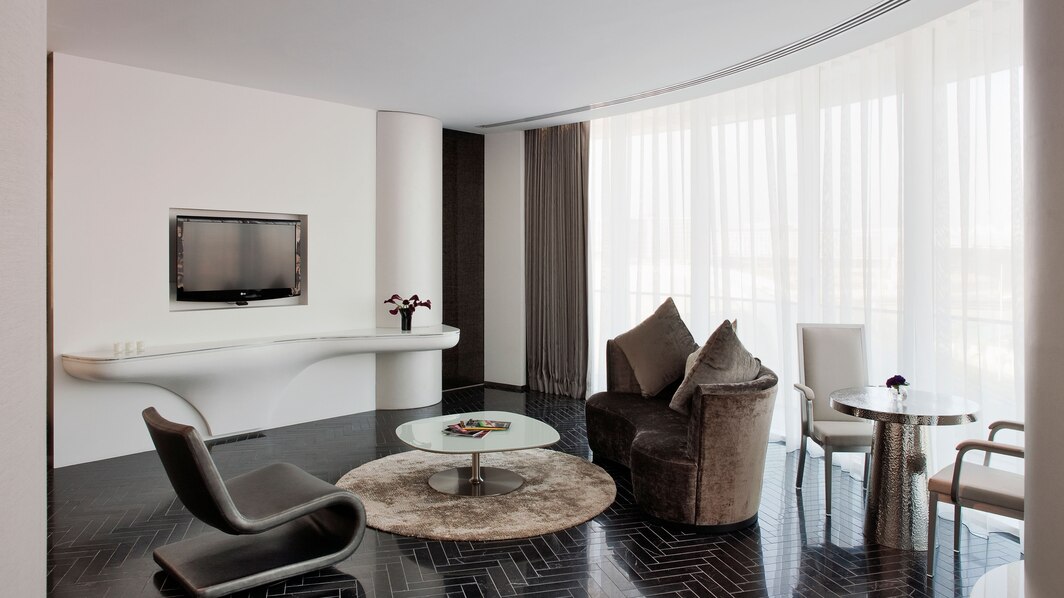102 кв. м. Просторный люкс с лаконичным дизайном состоит из спальни с кроватью «king sizе», отдельной гостиной с большим окном в пол, которая оборудована диваном и рабочим столом, ванной комнаты с отдельной ванной, душем и двойной раковиной, гардеробной, двух балконов. Доступно бронирование детской кроватки, дополнительной кровати и смежного номера. Вид на ипподром и трек F1 ™. Размещение: 3 человека.