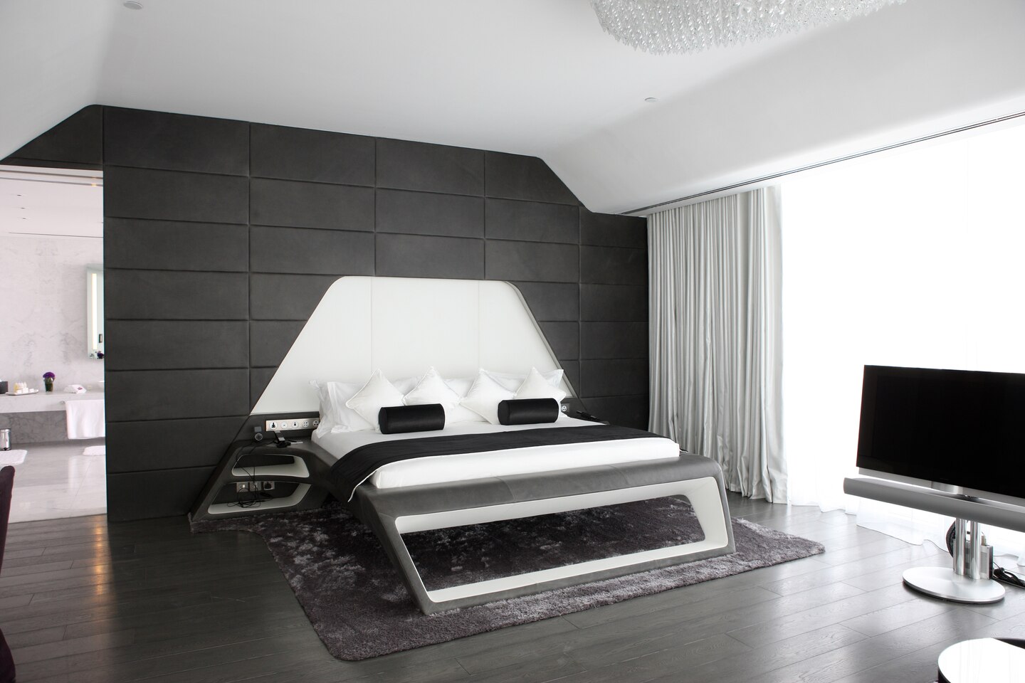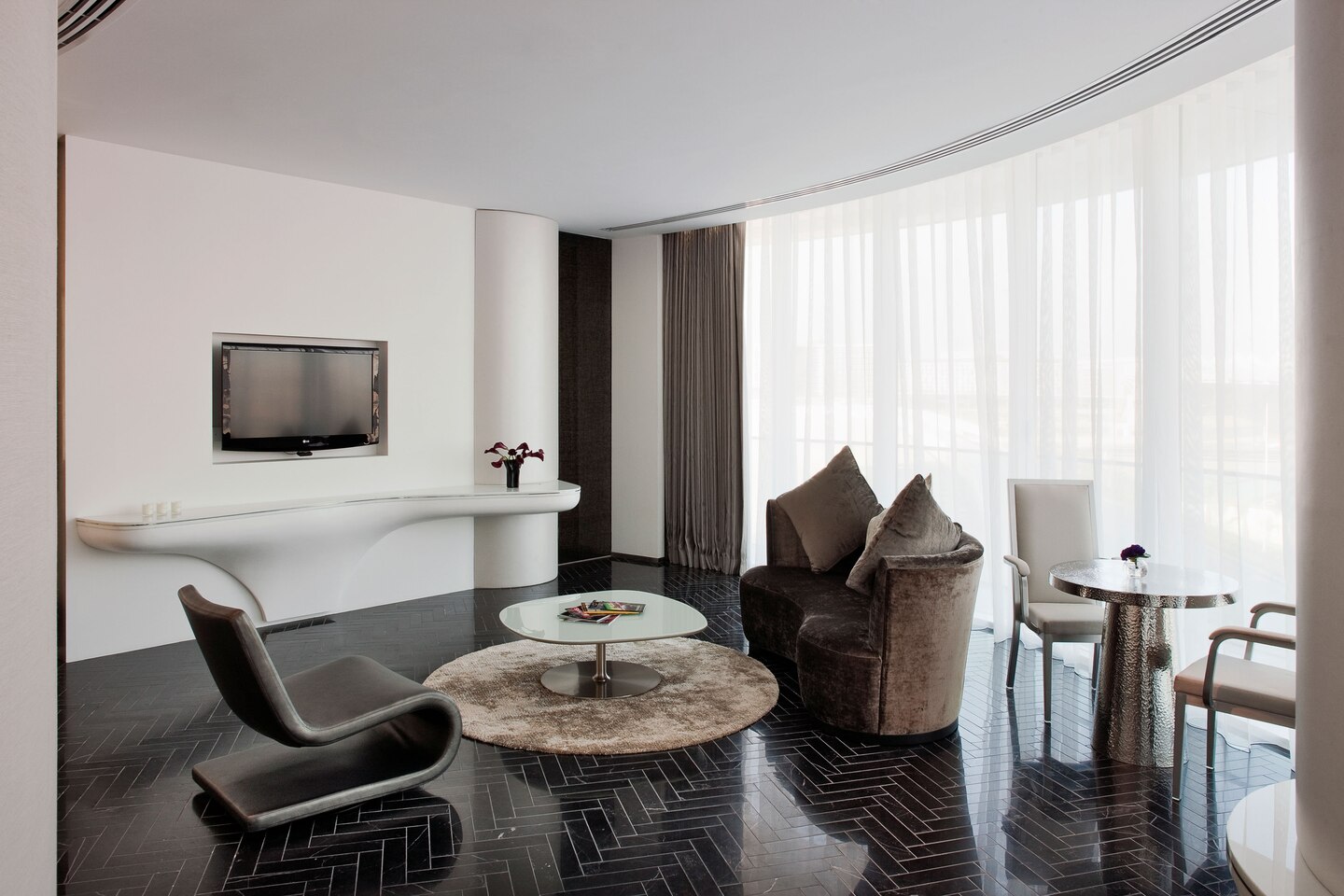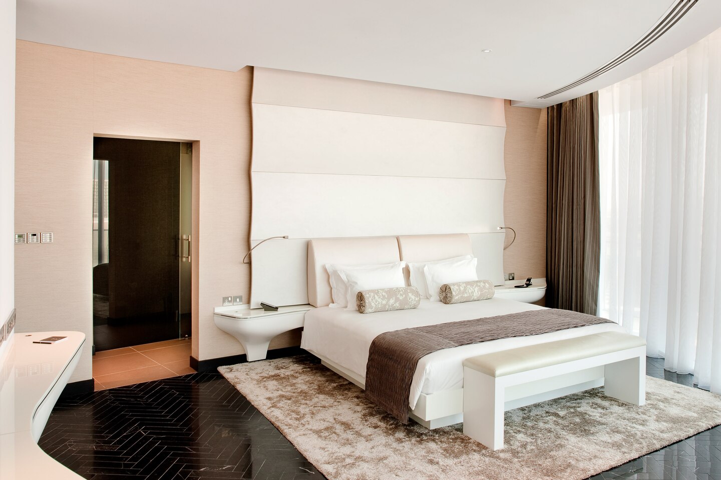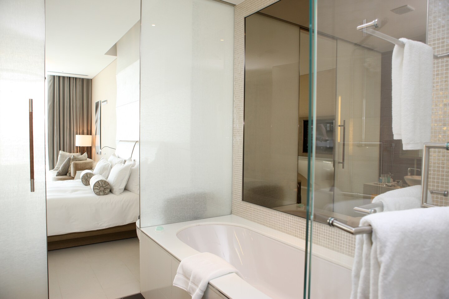 102 кв. м. Просторный люкс с лаконичным дизайном состоит из спальни с кроватью «king sizе», отдельной гостиной с большим окном в пол, которая оборудована диваном и рабочим столом, ванной комнаты с отдельной ванной, душем и двойной раковиной, гардеробной, двух балконов. Доступно бронирование детской кроватки, дополнительной кровати и смежного номера. Вид на ипподром и трек F1 ™. Размещение: 3 человека.