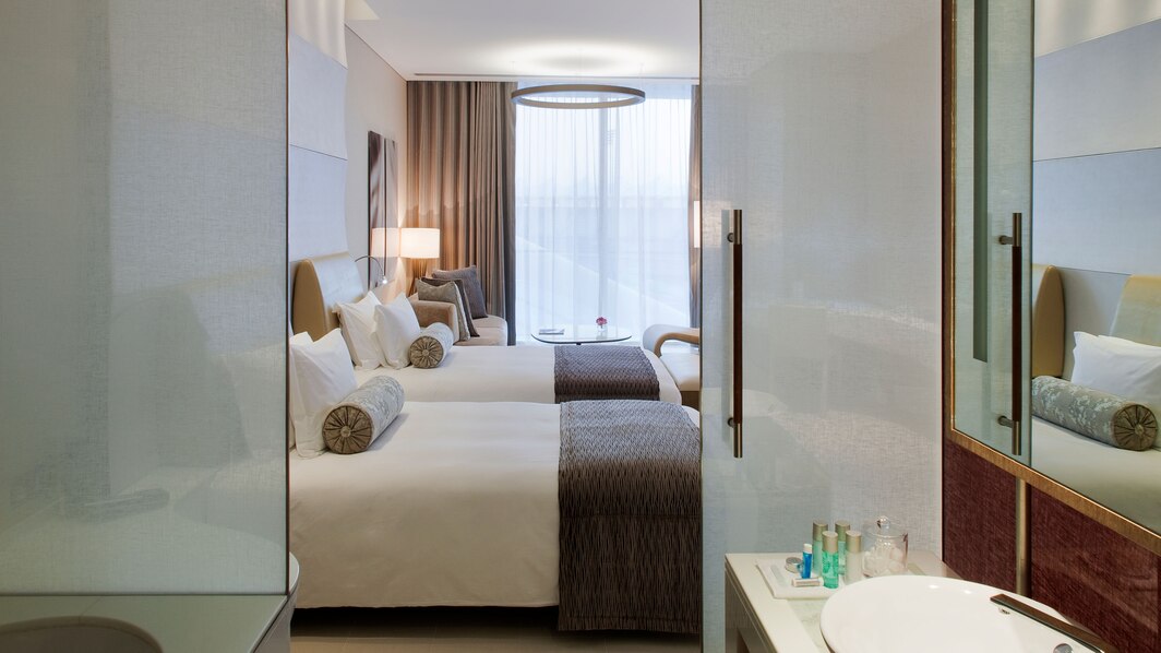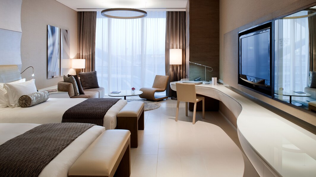 54 кв. м. Просторный номер, декорированный деревянными панелями, состоит из спальни с двумя кроватями размера «twin», уютной зоны отдыха с большим окном в пол, которая оборудована диваном, журнальным столиком и большим рабочим столом, ванной комнаты с отдельной ванной и душем, балкона. Доступно бронирование детской кроватки и дополнительной кровати и смежного номера. Вид на ипподром. Размещение: 3 человека.