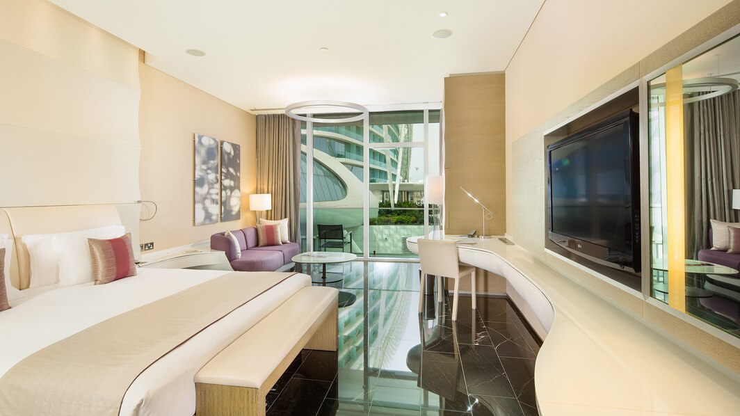 54 кв. м. Номер состоит из спальни, которая оборудована кроватью «king sizе», диваном, рабочим столом, креслом, ванной комнаты с отдельной ванной и душем, балкона. Доступно бронирование детской кроватки, дополнительной кровати и смежного номера. Вид на Яс-Марина. Размещение: 3 человека.