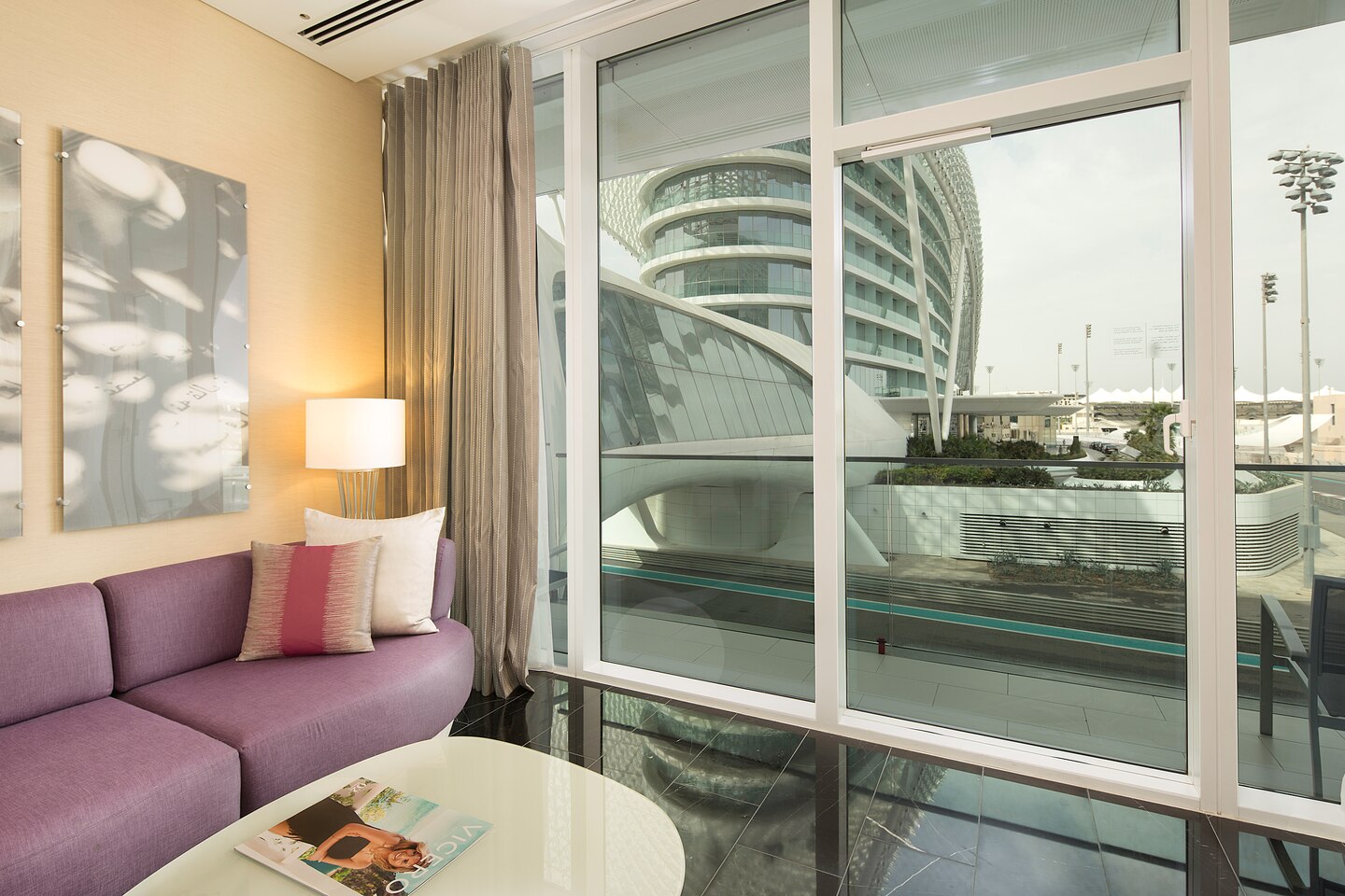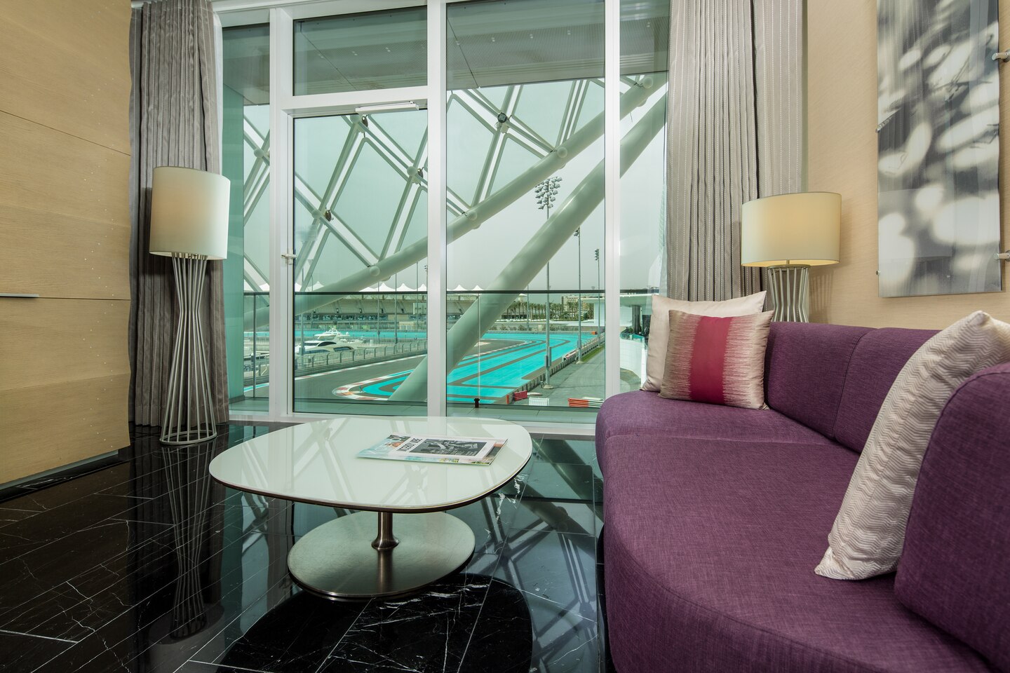 54 кв. м. Номер состоит из спальни, которая оборудована двумя кроватями размера «twin», диваном, рабочим столом, креслом, ванной комнаты с отдельной ванной и душем, балкона. Доступно бронирование детской кроватки и дополнительной кровати и смежного номера. Вид на Яс-Марина. Размещение: 3 человека.