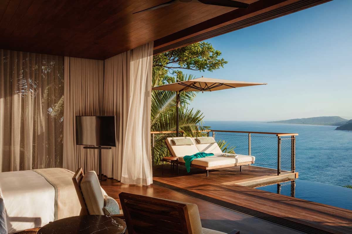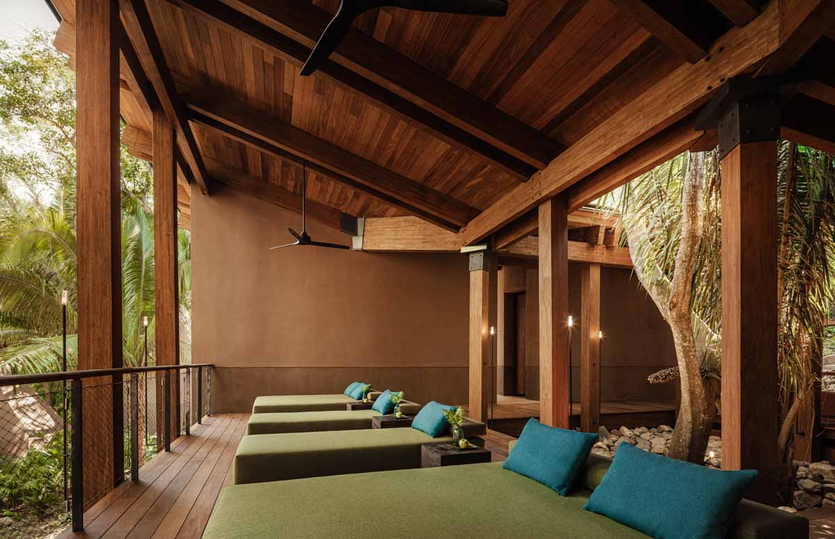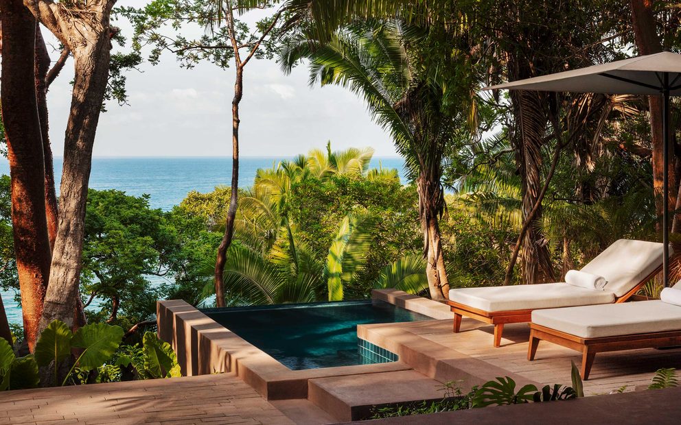 Роскошный комплекс объединяет разбросанные на удалении друг от друга уединенные виллы в современном стиле, созданные из экологичных материалов и гармонично вписанные в окружающий пейзаж. Каждого гостя здесь встречают ударом в бронзовый гонг, который мягким эхо разносится по всему павильону и сообщает команде курорта о новых прибывших. Этот гонг был создан специально для курорта One&Only Mandarina. У входа на территорию раскинулось величественное древнее дерево игуэра, «хранитель» курорта, за которым открывается захватывающий вид на Тихий океан. Встреча гостей происходит на открытом пространстве – своего рода гостиной у мерцающего бассейна черного цвета, отражающего крону игуэры и яркого неба за ним.
