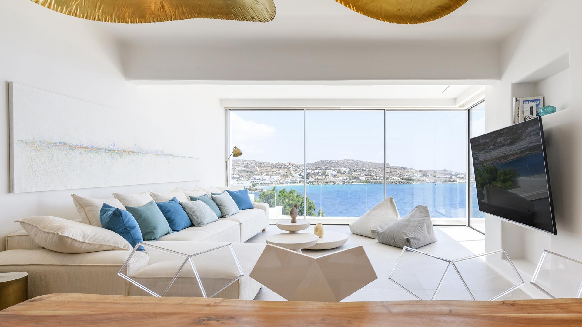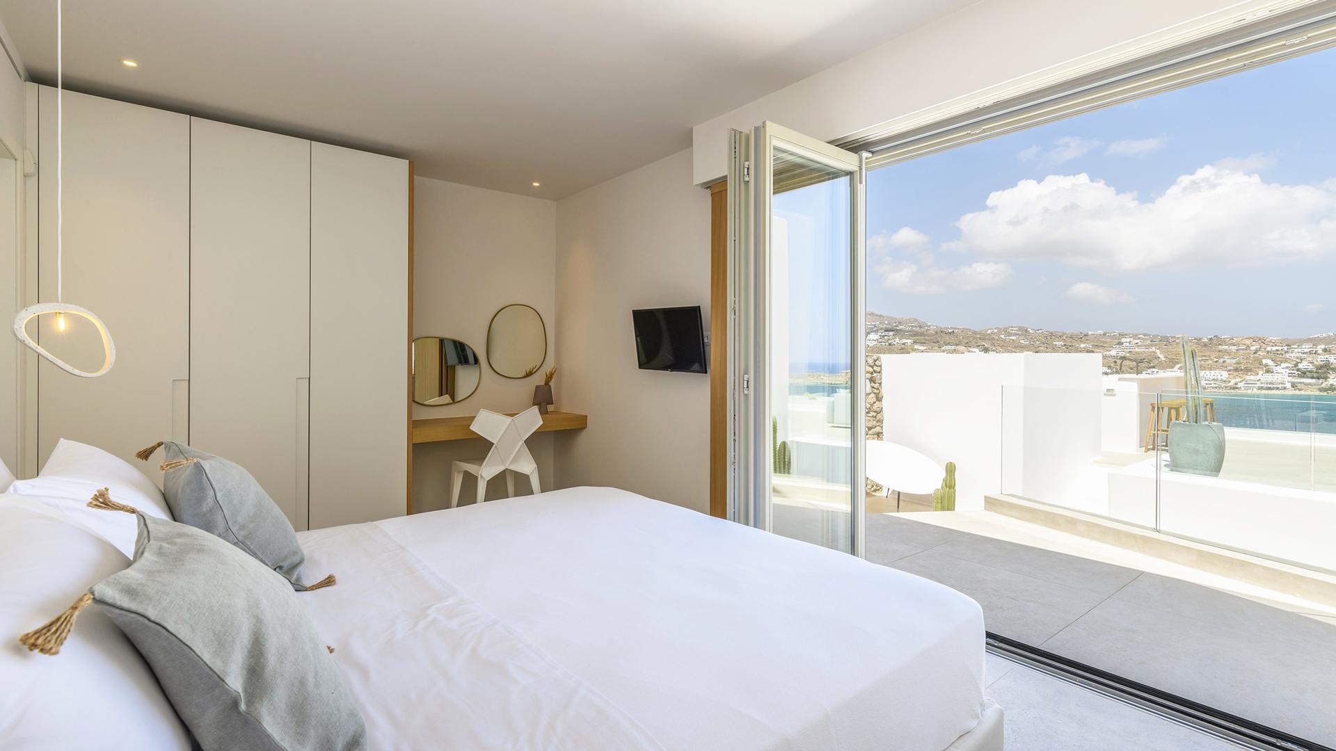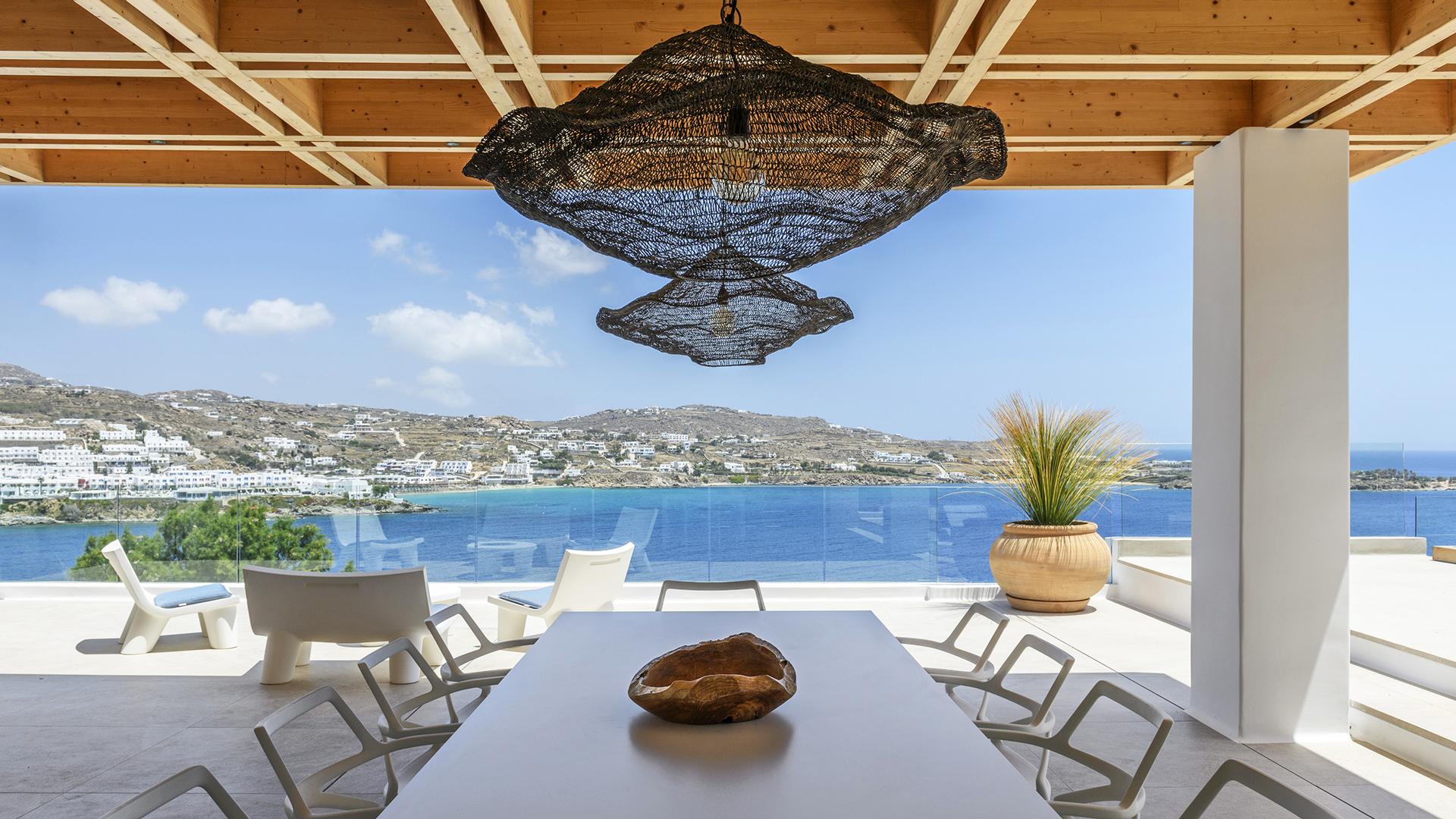 Вилла занимает южное положение на склоне Agios Lazaros, с видом на Эгейское море. До самых популярных пляжей (Psarou, Platis Gialos, Ornos) — несколько минут езды; до центра Миконоса — около 4 км.