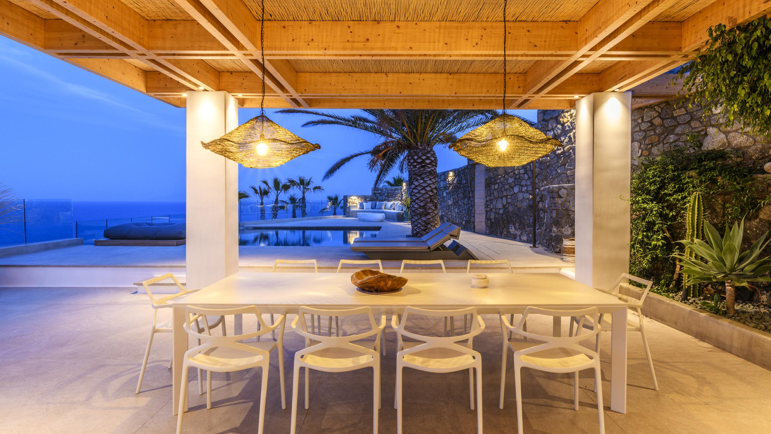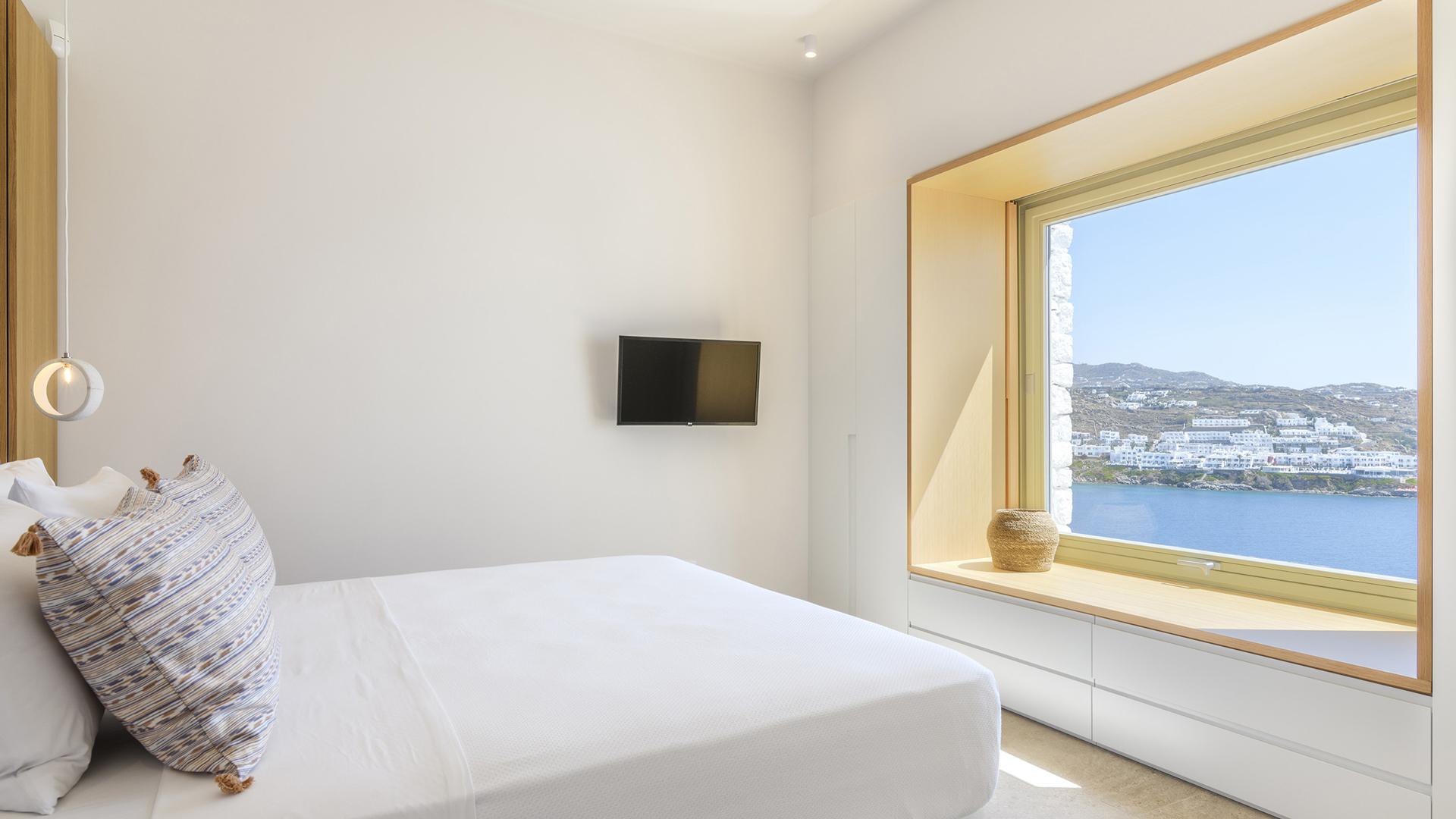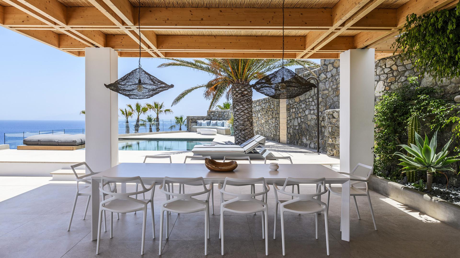 Вилла занимает южное положение на склоне Agios Lazaros, с видом на Эгейское море. До самых популярных пляжей (Psarou, Platis Gialos, Ornos) — несколько минут езды; до центра Миконоса — около 4 км.