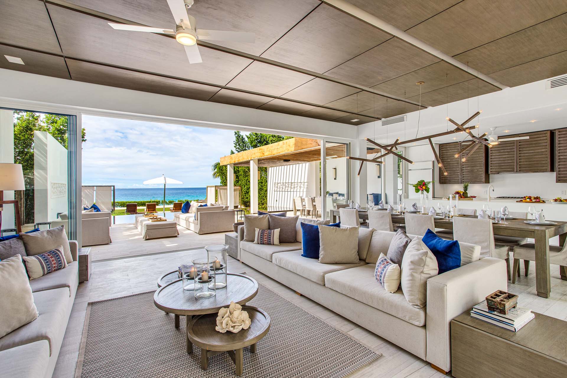 - Общие жилые и обеденные зоны, плавно переходящие в открытые обеденные и лаунж-пространства