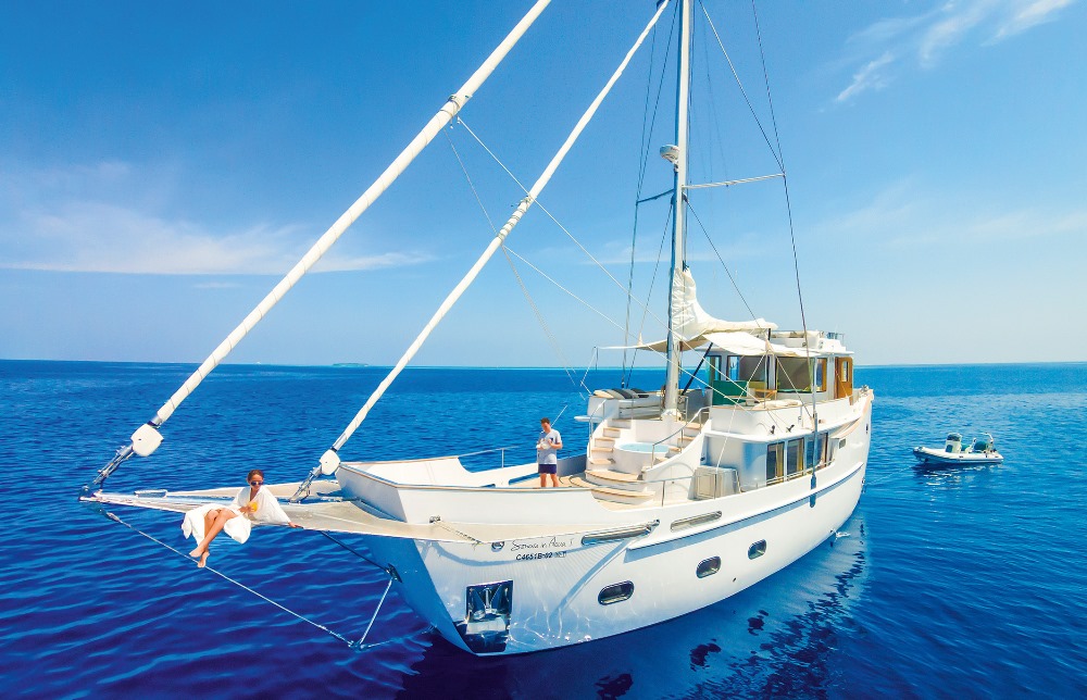 На борту 23-метровой яхты две спальни, душевые, ванна с прозрачным дном, джакузи под открытым небом. Всегда к вашим услугам капитан, су-шеф, батлер, спа-терапевт. По вашему желанию, в путешествии вас будут сопровождать астроном и инструктор по дайвингу.