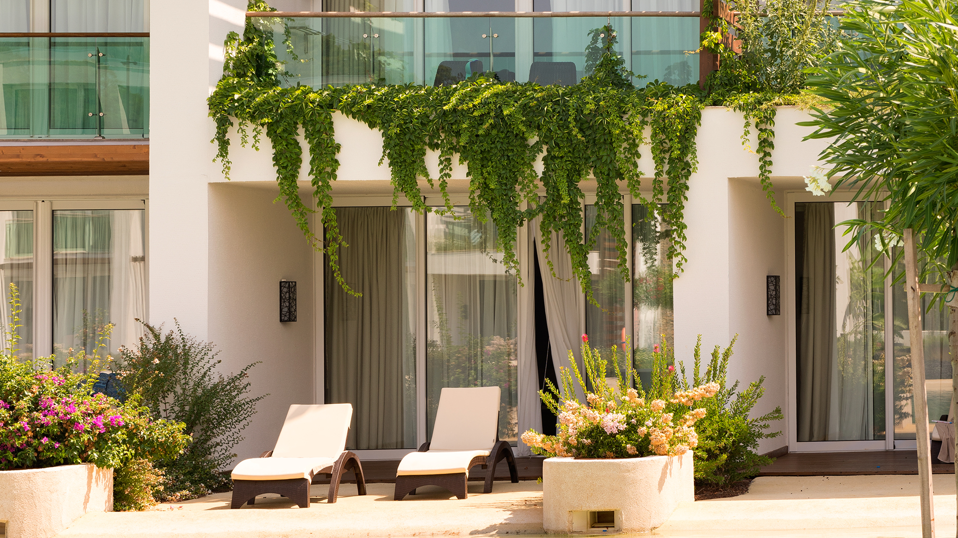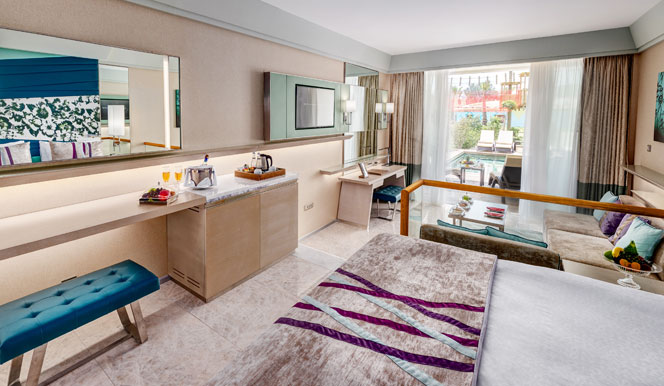 45 кв.м. У номері розташовані 1 спальня з двоспальним ліжком, робочий стіл, м'який куточок, тераса, басейн, ванна кімната з душем та туалетом, балкон, номери на 1 поверсі мають прямий вихід до басейну. Розміщення: 2+1