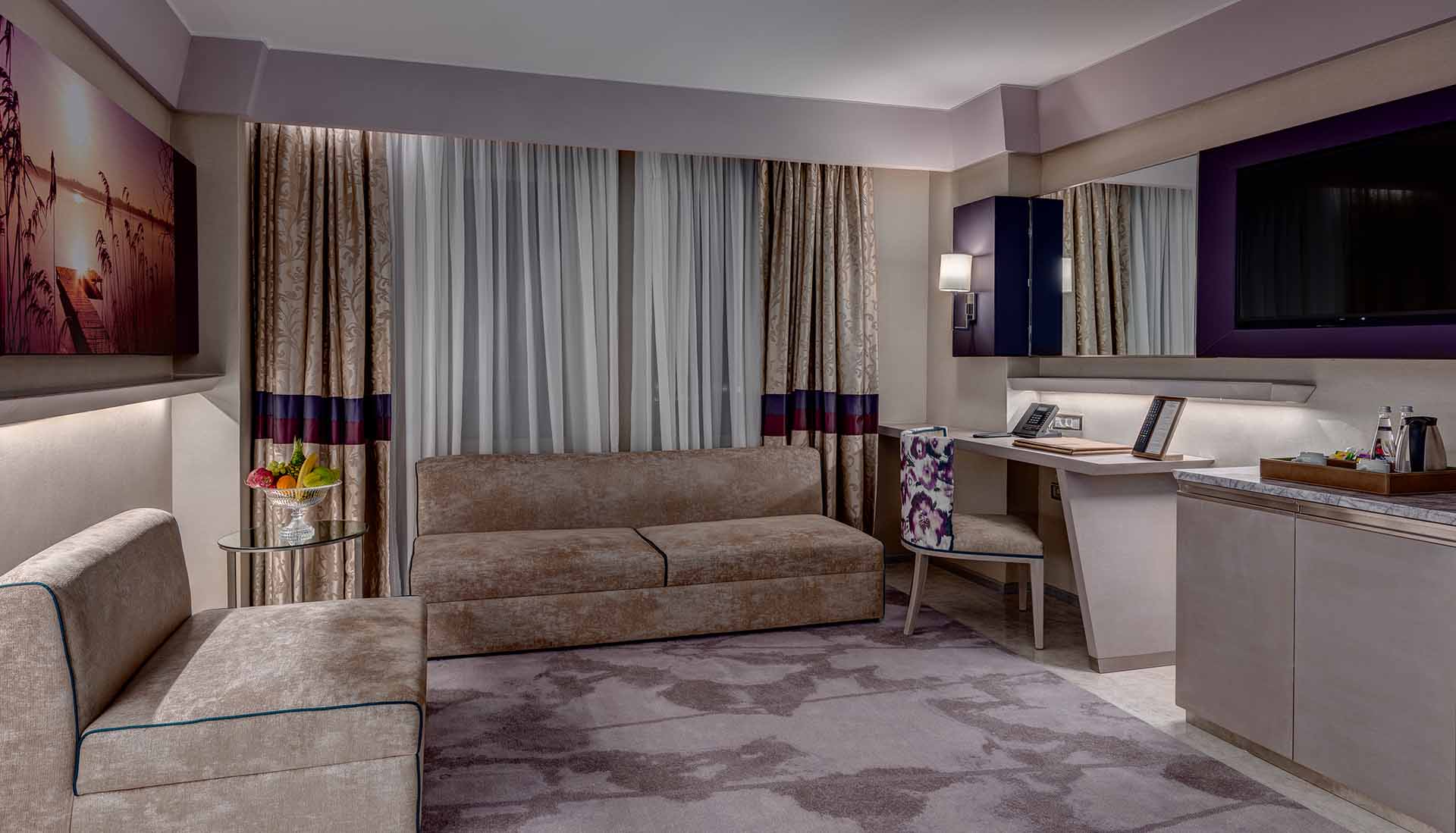 100 кв. м. У номері розташовані спальня, простора вітальня з робочим столом та зоною відпочинку, міні-бар, 2 ванні кімнати з душем та туалетом, балкон. Розміщення: 3 особи.